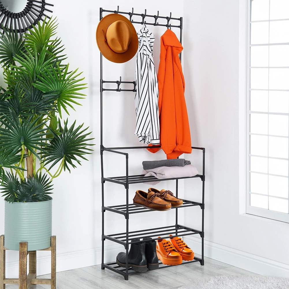 - Multifunkciós 3 az 1-ben: ruhafogas, akasztók kiegészítőknek és cipőtartó polc