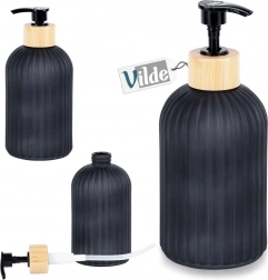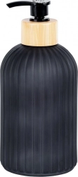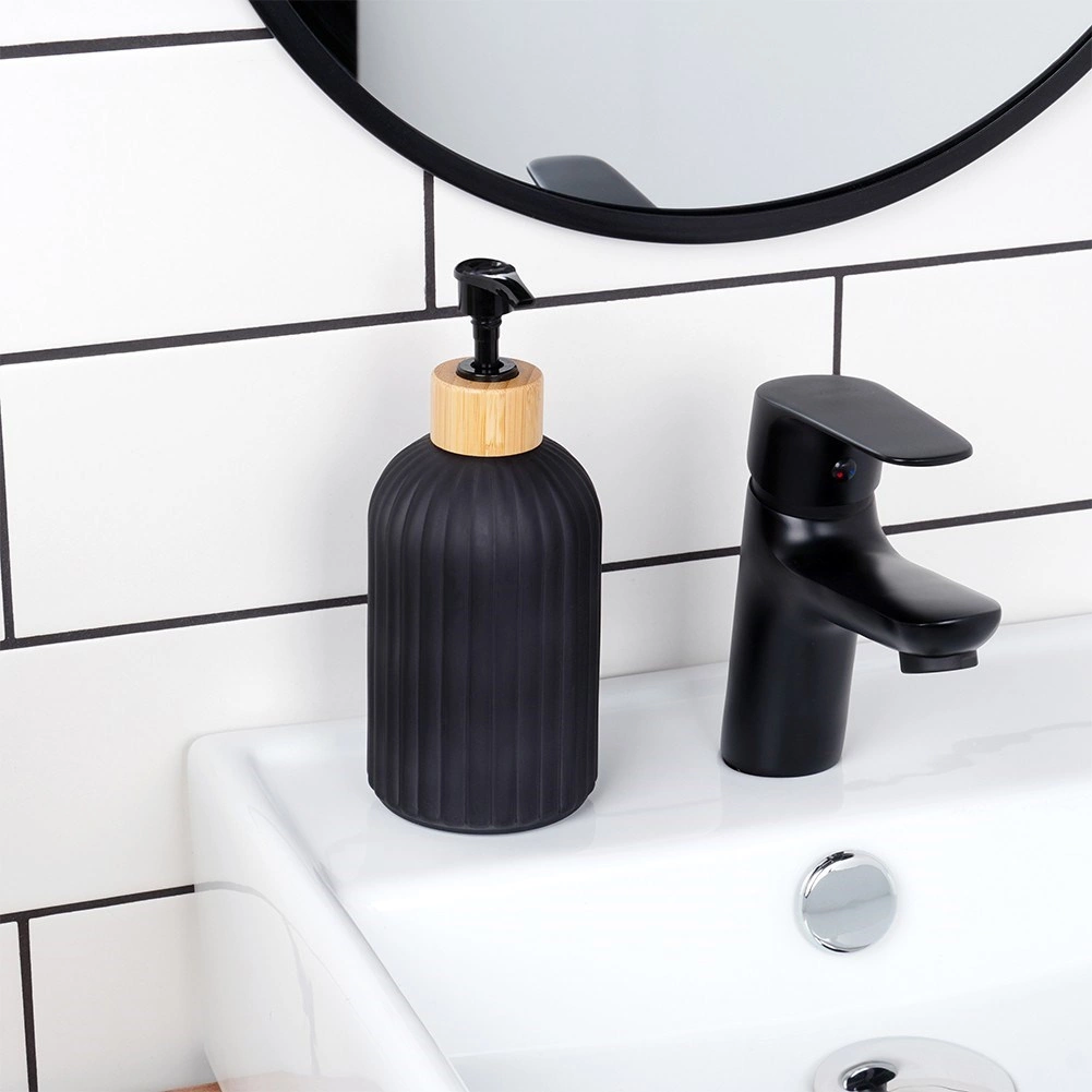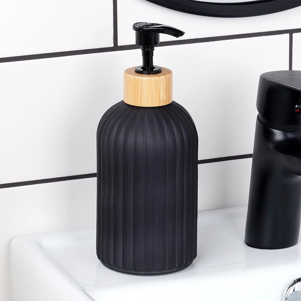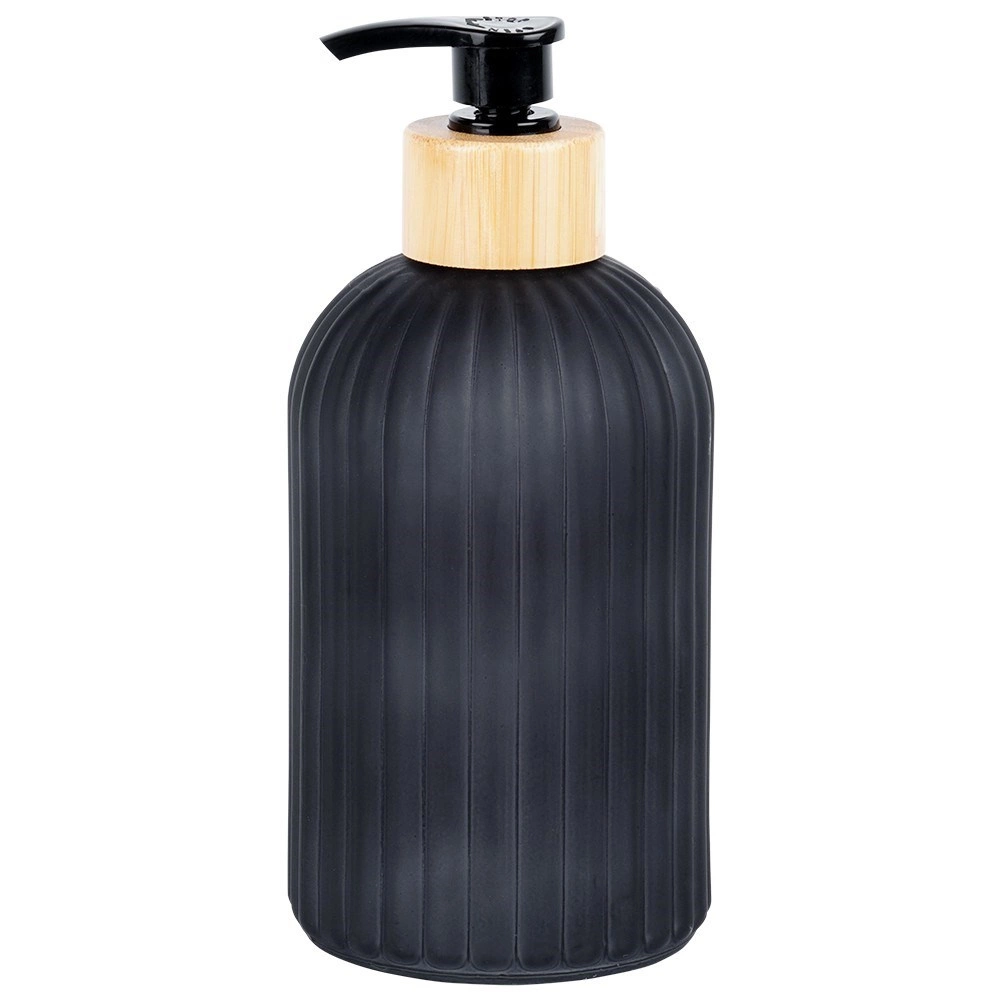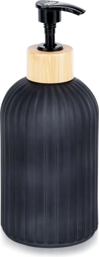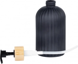 Elegáns, 400 ml űrtartalmú üveg szappanadagoló matt fekete kivitelben, természetes bambuszgyűrűvel és fekete pumpával. A csúszásgátló, bordázott felületnek köszönhetően jól kézben tartható, könnyen utántölthető, és modern, minimalista dizájnjával díszíti a fürdőszobát és a konyhát egyaránt. A praktikus, zárható pumpa megkönnyíti a szállítást és megakadályozza a folyadék szivárgását.