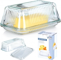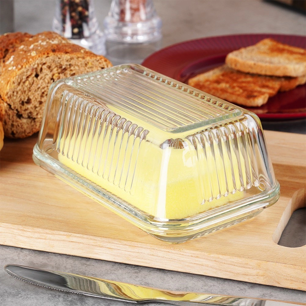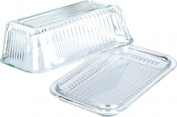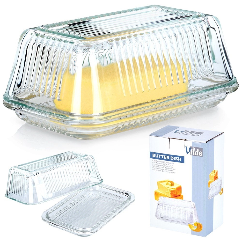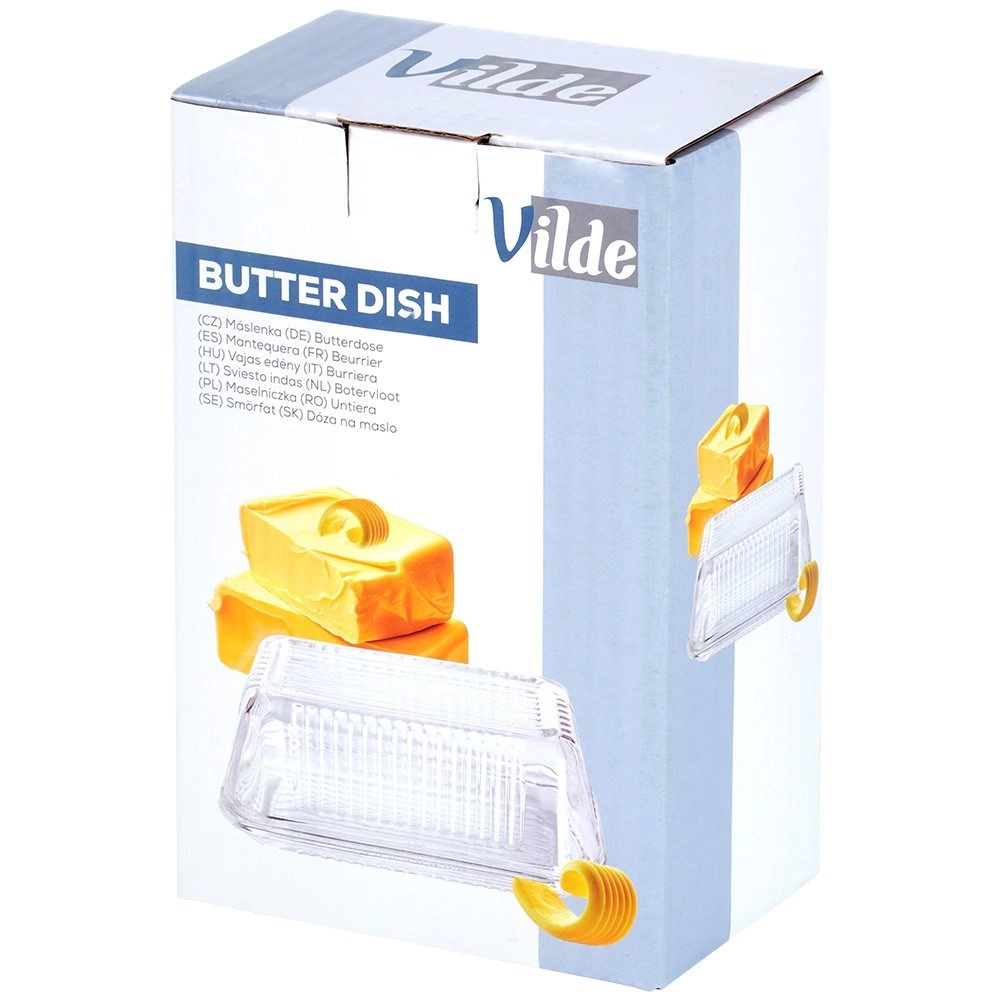 A Vilde üvegvajtartó stílusos és praktikus kiegészítő minden konyhába. Az átlátszó, minőségi üveg dekoratív bordázással kiemeli az elegáns megjelenést, és megkönnyíti a fogást. A klasszikus téglalap forma bármilyen terítékhez illik, kényelmes vajtálalást és áttekinthető hűtős tárolást biztosít.