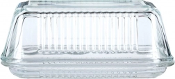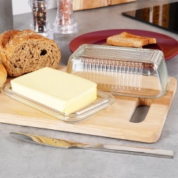A tető megbízhatóan védi a vajat a kiszáradástól, a nemkívánatos szagoktól és a portól, így tovább megőrzi frissességét és teljes ízét. Az átlátszó kialakításnak köszönhetően könnyen ellenőrizhető a készlet. A tartós üveg egyszerű karbantartást biztosít – a vajtartó mosogatógépben mosható.