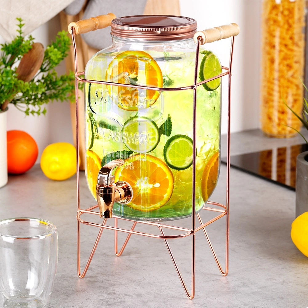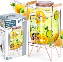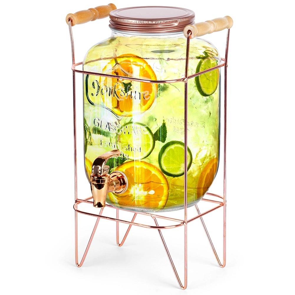 Elegáns, 4,2 l űrtartalmú üveg italkiöntő stabil, rózsaarany színű állvánnyal és praktikus csappal a könnyű tálaláshoz. Ideális limonádékhoz, puncsokhoz, gyümölcsös vizekhez és jeges teákhoz ünnepségeken, grillezésen és családi összejöveteleken. A széles nyak megkönnyíti a jég és gyümölcs hozzáadását, a csavaros tető pedig megvédi az italt a rovaroktól.