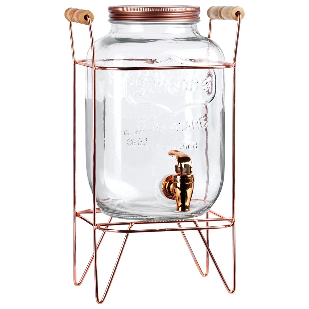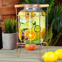 Ez a stílusos adagoló a minőségi, vastag üveget dekoratív dombornyomott mintázattal és rózsaarany árnyalatú, fa fogantyúkkal ellátott fém állvánnyal ötvözi. A megemelt elhelyezés kényelmes töltést biztosít a poharakba anélkül, hogy mozgatni kellene az edényt. A fém, csavaros tető megóvja a tartalmat a szennyeződésektől és a rovaroktól, így tökéletes kültéri és beltéri használatra egyaránt.