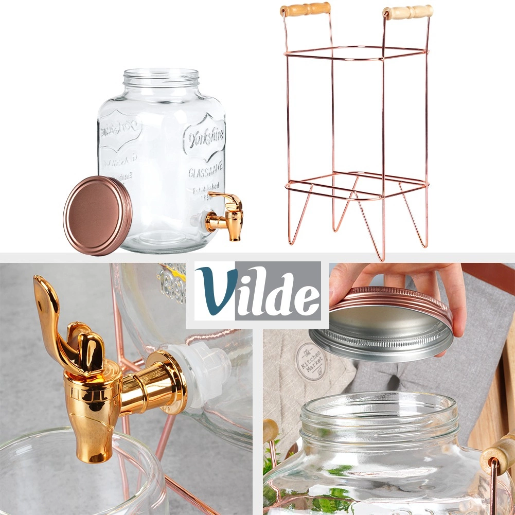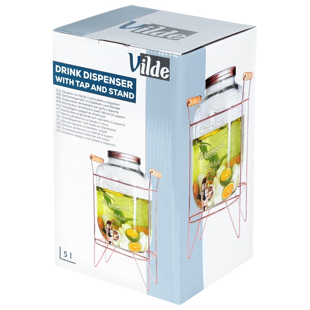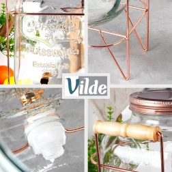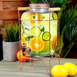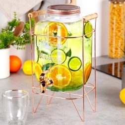 Elegáns üveg italadagoló 5,5 l űrtartalommal, stabil fém állvánnyal rózsaarany színben, ideális limonádéhoz, vízhez, jeges teához és puncshoz. A tömítéssel ellátott csap kényelmes és tiszta töltést biztosít, a csavaros fedél megvédi az italt a rovaroktól, a átlátszó, vastag üveg dombornyomással pedig stílusosan kiemeli a gyümölcsöt és a jeget.