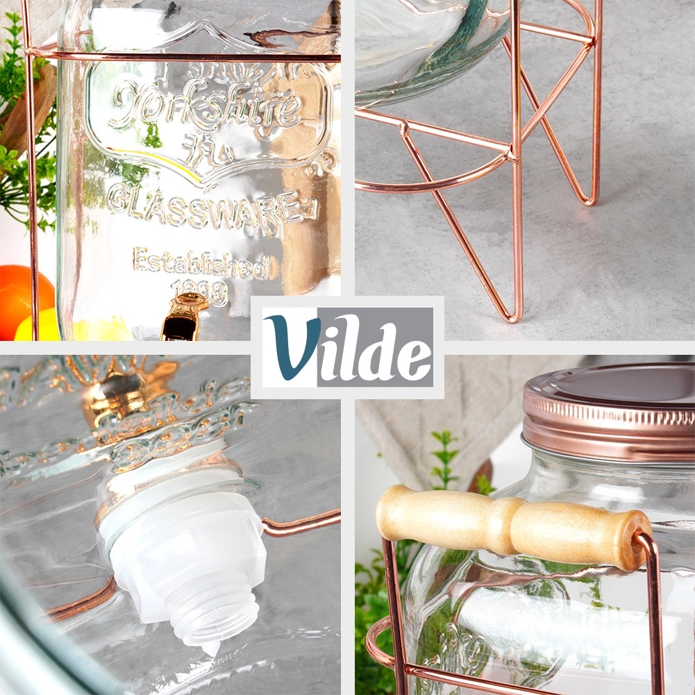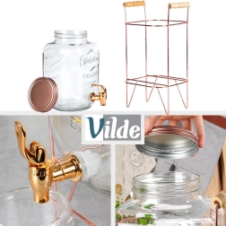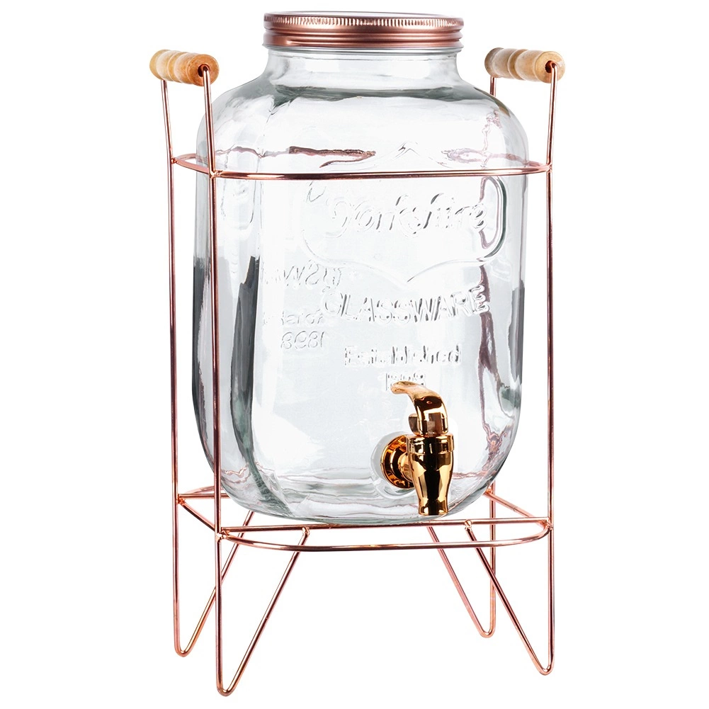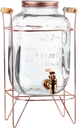 Ez a stílusos italadagoló ötvözi a tartós vastagfalú üveget a masszív fém állvánnyal rózsaarany árnyalatban, fa fogantyúkkal a könnyű hordozhatóságért. A praktikus csap egyenletes, kiömlésmentes töltést biztosít, míg a csavaros fedél tisztán és védetten tartja a tartalmat. Remek megoldás kerti partikra, családi ünnepekre és cateringhez.
