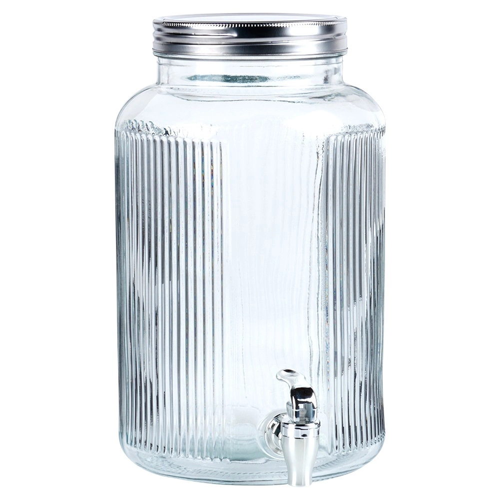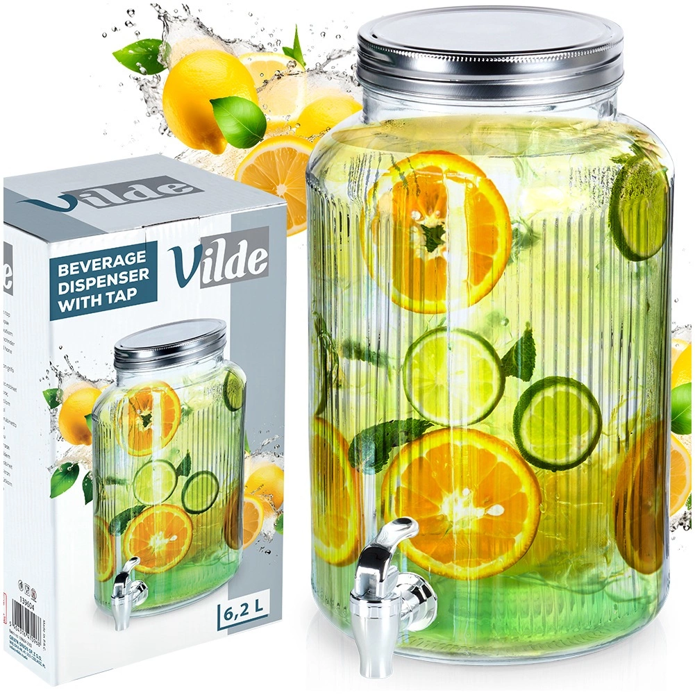 Elegáns, 6,2 l kapacitású üveg italkiöntő praktikus csappal és csavaros fedéllel, amely stílust és funkcionalitást ötvöz limonádé, gyümölcsös víz vagy jeges tea tálalásához. Az erős, vastag üveg bordázott dizájnnal élelmiszer-biztonságos, és remekül mutat kerti partin vagy otthon.