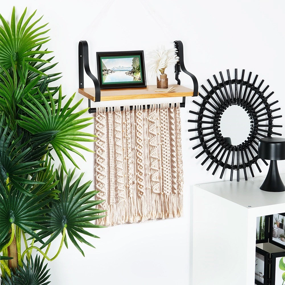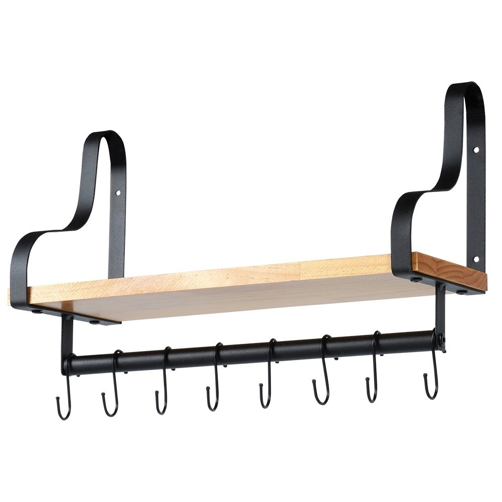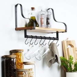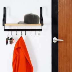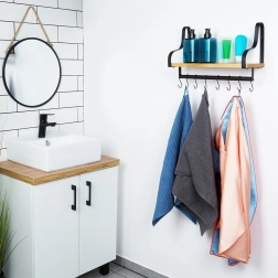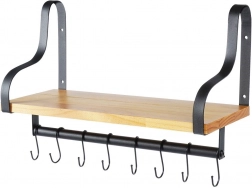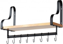Fedezze fel az otthoni rendszerezés okos megoldását. Ez a fali polc stabil, természetes fából készült tárolófelületet és alatta hasznos relinget 8 kampóval kínál bögrék, konyharuhák, kulcsok vagy törölközők felakasztásához. A minimalista, fekete fémkeret indusztriális, modern megjelenést biztosít, amely könnyen összehangolható modern és klasszikus enteriőrökkel is.