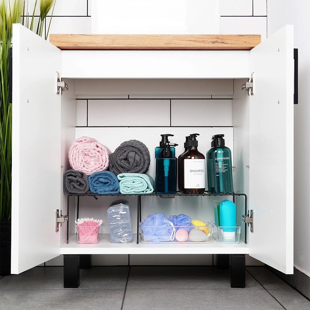 Hozza ki a legtöbbet minden polcból. A teleszkópos fém polc elegáns fekete színben hatékonyan osztja két szintre a szekrény belmagasságát, így az edények, konzervdobozok vagy poharak áttekinthetően és biztonságosan tárolhatók. A 34,5–48 cm között fokozatmentesen állítható hossznek köszönhetően könnyen igazítható különböző szélességű szekrényekhez és polcokhoz.