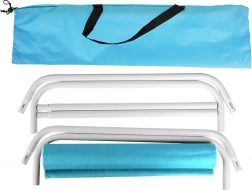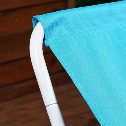 A strandszék kényelmes kültéri pihenésre készült. A tartós, fehér fémváz és a kék poliészter szövet stabilitást és kellemes, alacsony relax pozíciójú ülést biztosít. Az okos összecsukó mechanizmusnak köszönhetően könnyedén elpakolható a mellékelt táskába, és magával viheti a strandra, piknikre vagy nyaralásra.