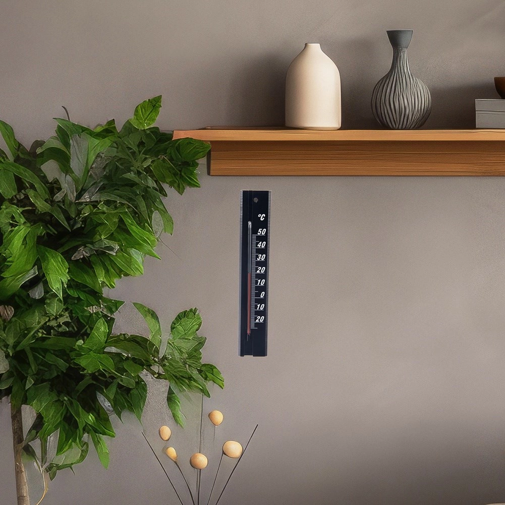 Univerzális, falra szerelhető hőmérő elegáns fekete kivitelben, amely bármely beltéri vagy kültéri környezetbe illik. Az áttekinthető Celsius-skála lehetővé teszi az aktuális hőmérséklet gyors és pontos leolvasását akár a nappaliban, konyhában, az erkélyen vagy a kertben.
