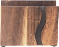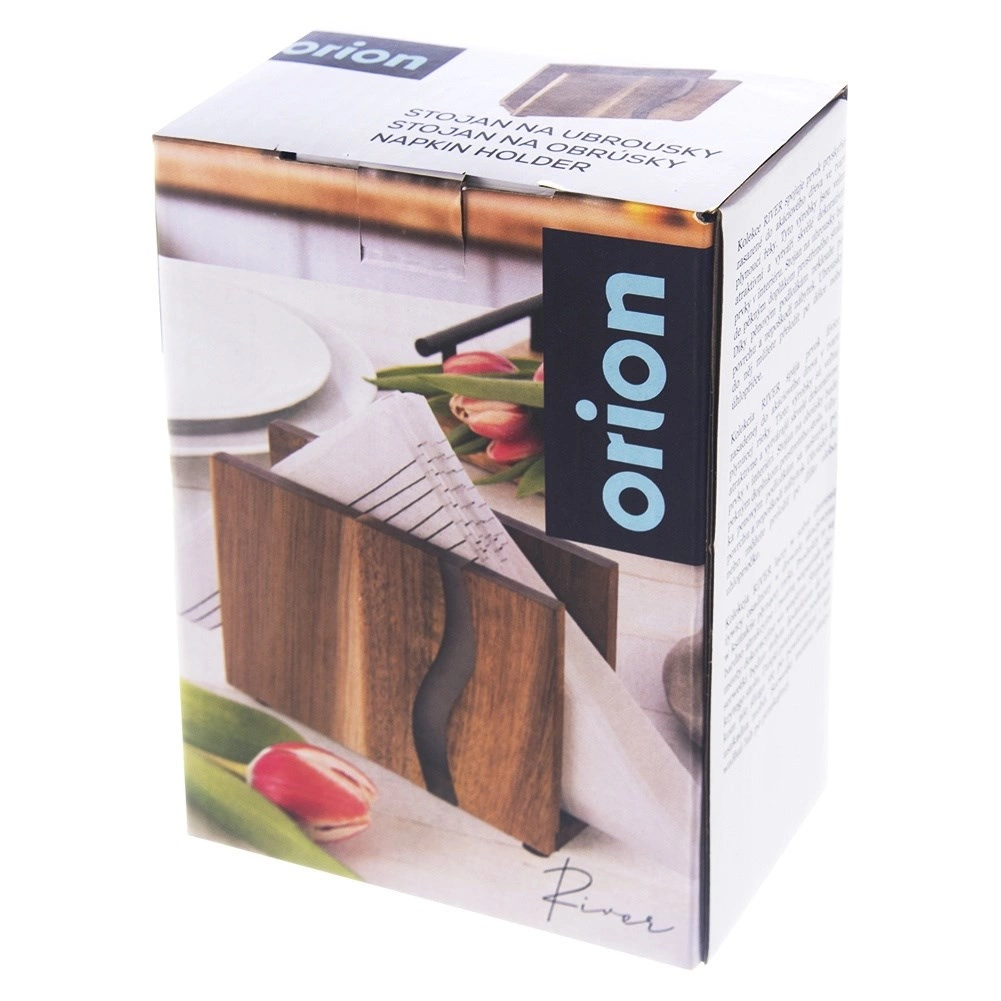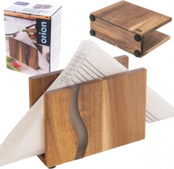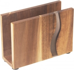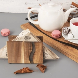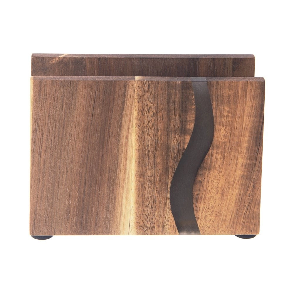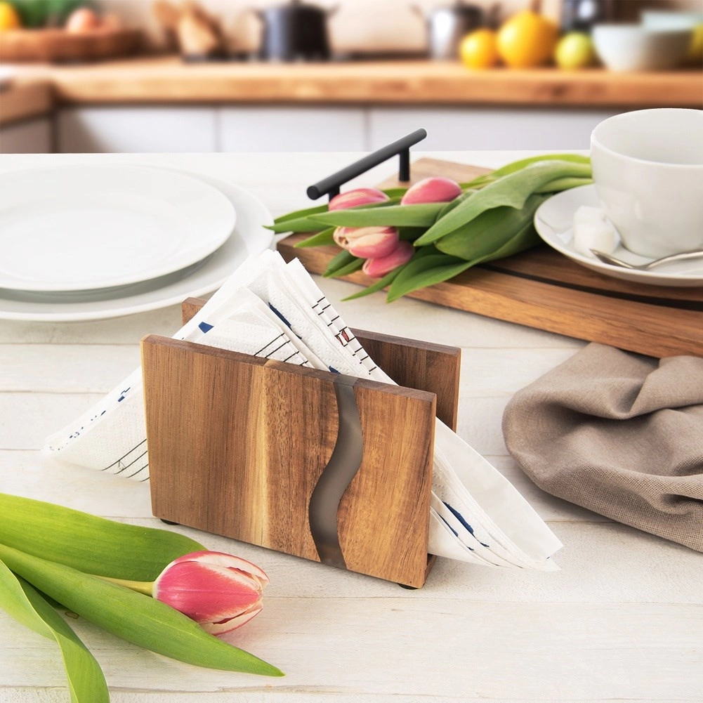 Elegáns és praktikus fa szalvétatartó akácfából, stílusos, folyót formázó gyantabetéttel. Rendezetten tartja a szalvétákat, stabil, a filc talpaknak köszönhetően védi az asztalt, és remekül illik otthonokba és vendéglátóhelyekre is.