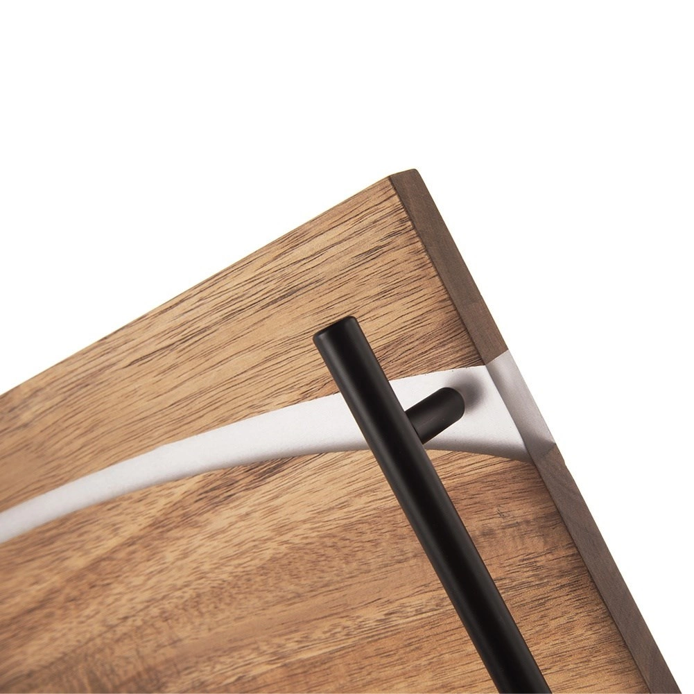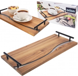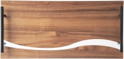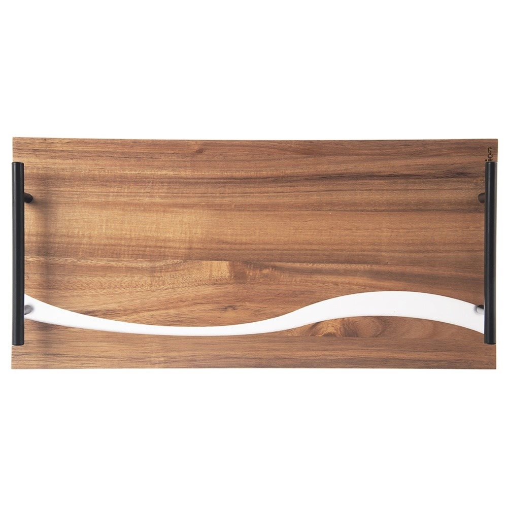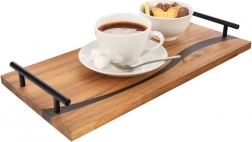 Stílusos szervírozótálca akácfából, stabil fém fogantyúkkal és dekoratív, „folyó” hatású gyantával. Ideális kávé, tea, desszertek és snackek szervírozásához otthon és a vendéglátásban. Méretek: 42 × 20 × 4,5 cm (magasság fogantyúk nélkül 1,5 cm). Masszív kivitel, kellemesen sima felület és indusztriális LOFT stílus – látványos kiegészítő és egyben praktikus eszköz.