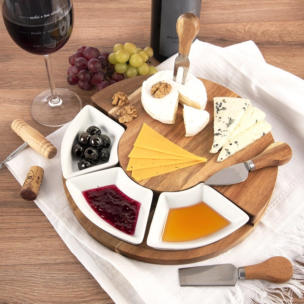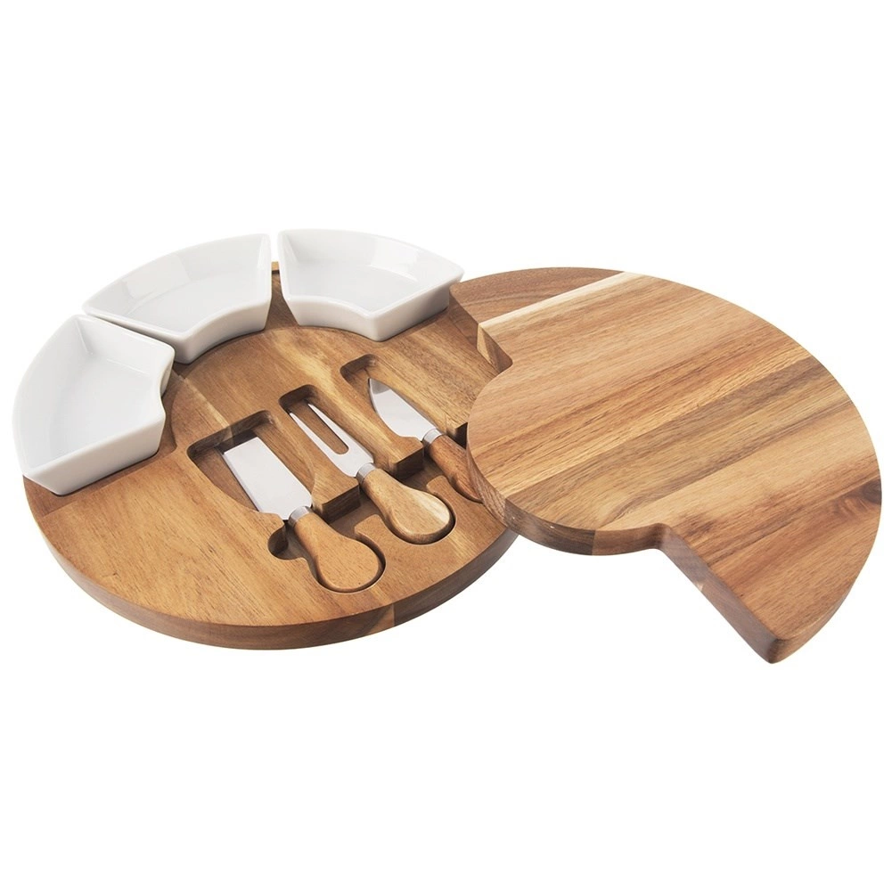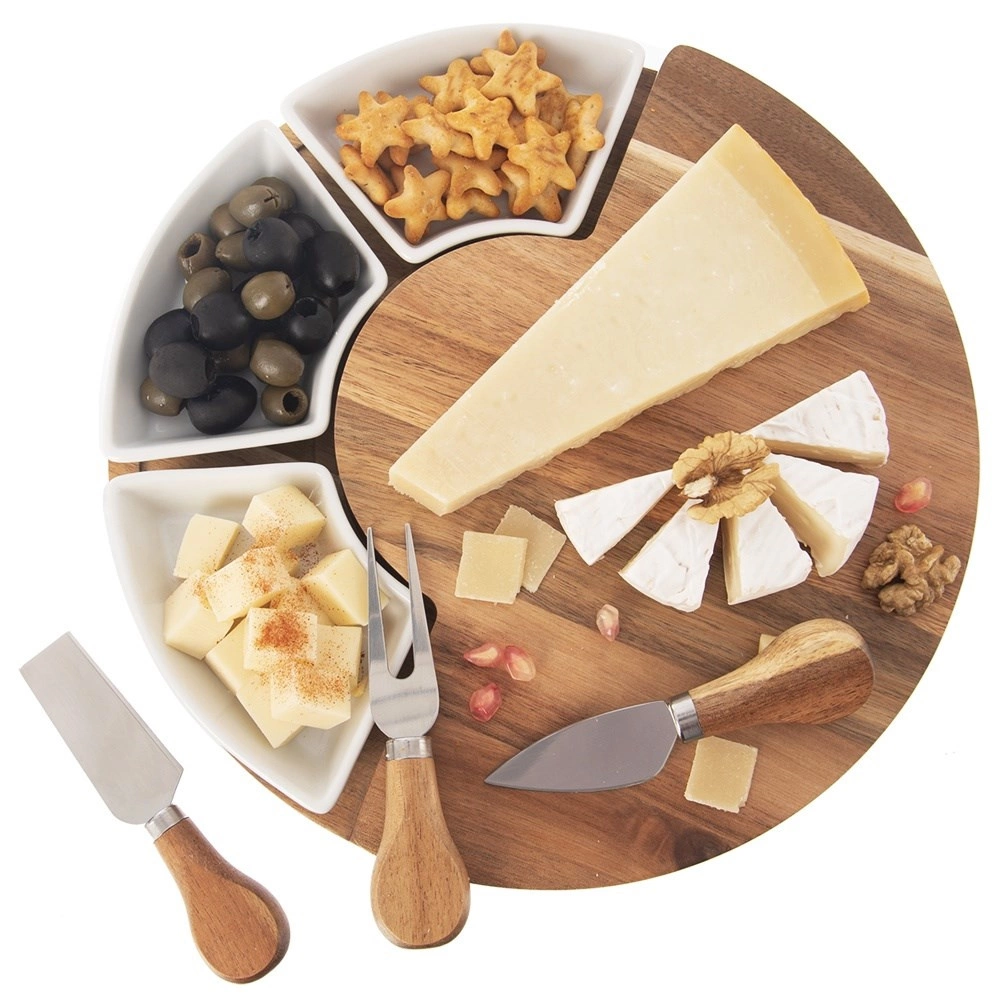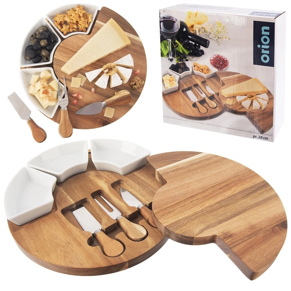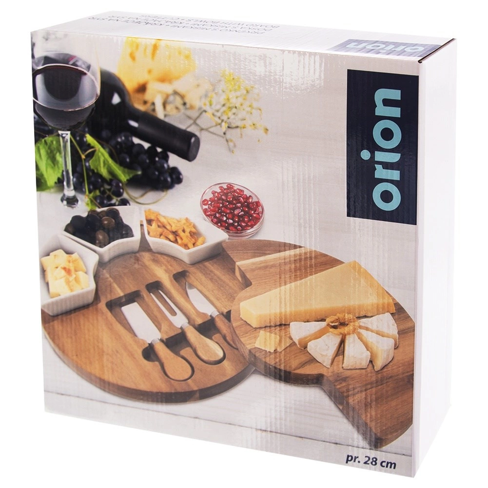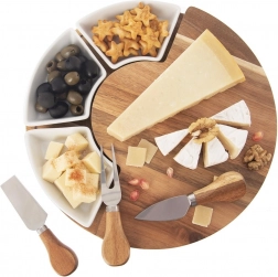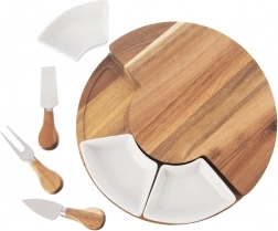 A három eszközzel (kés, spatula és villa) a lágy, félkemény és kemény sajtokat is könnyedén kezelheti. A három kerámia tálka mártogatósokhoz, csatnihoz, olívához vagy diófélékhez használható, így pillanatok alatt látványos sajtállványt készíthet. A természetes akác tartós és gyönyörű erezetű, a kerámia higiénikus és könnyen tisztítható.