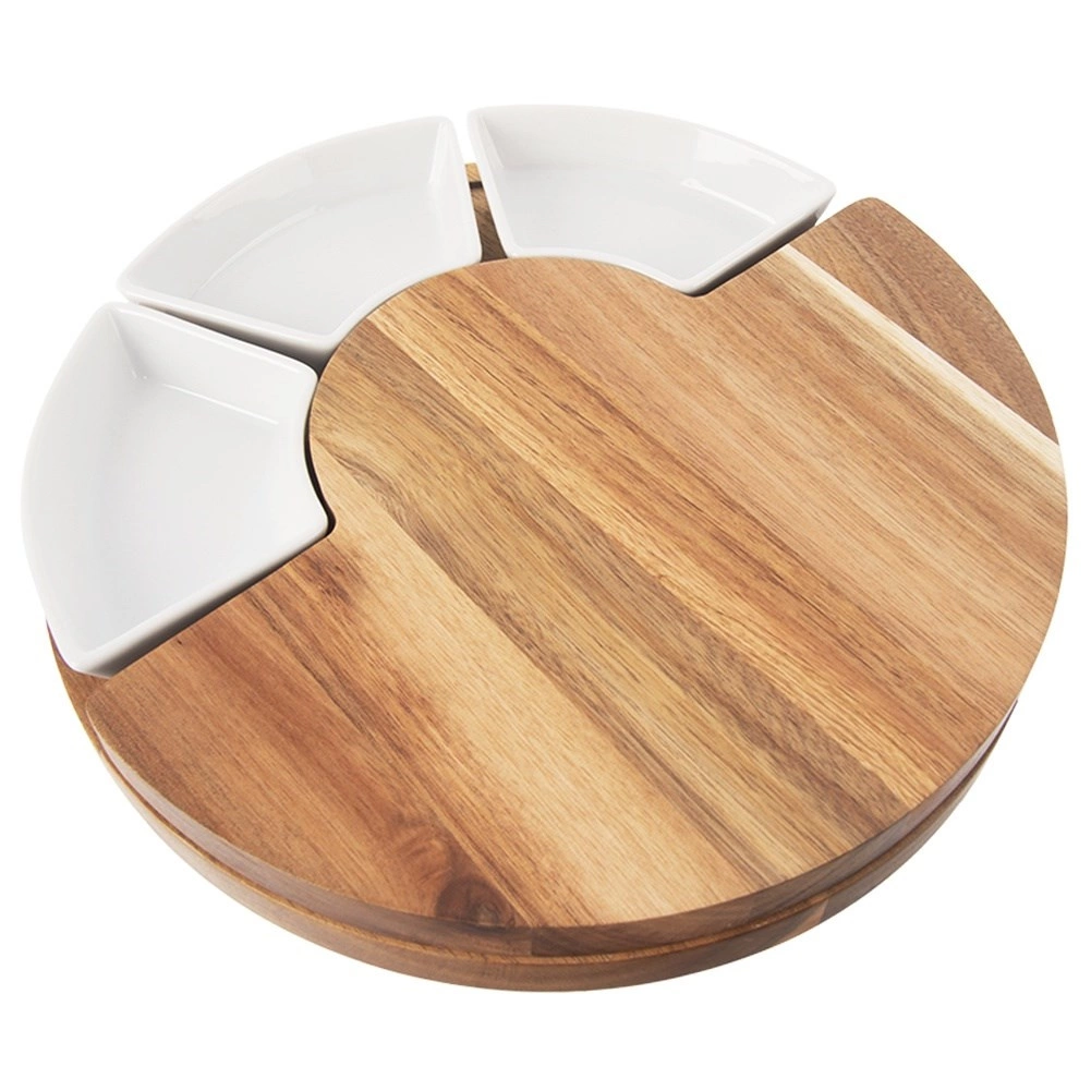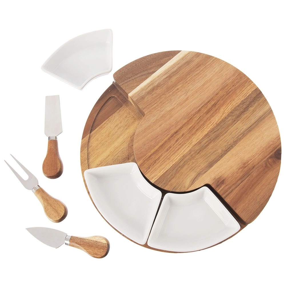 Ez a 7 részes sajtkészlet a természetes akácfát, a rozsdamentes acélt és a fehér kerámiát ötvözi az elegáns szervírozásért. A forgatható/összecsukható tálalódeszka több szervírozó zónát hoz létre, és felfedi a beépített késrekeszt – mindent kéznél tarthat. Remek választás családi ünnepekre, baráti összejövetelekre és a mindennapi finomságokhoz.
