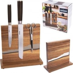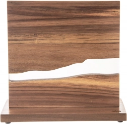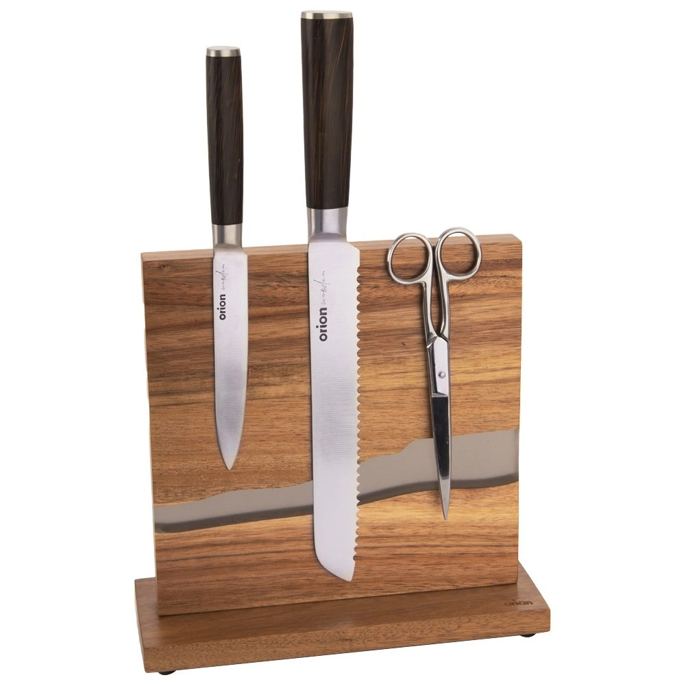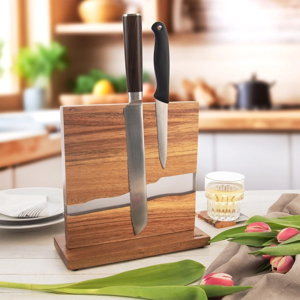 Elegáns, kétoldalas késállvány természetes akácfából, dekoratív „folyó” stílusú gyantabetéttel. Kínál erős mágneses felületet, a kések és ollók biztonságos, áttekinthető tárolását, valamint modern dizájnt, amely bármely konyhába illik. A kétoldalas tárolásnak köszönhetően helyet takarít meg a pulton, a talpon lévő filcpárnák pedig megóvják a munkalapot a karcolásoktól.