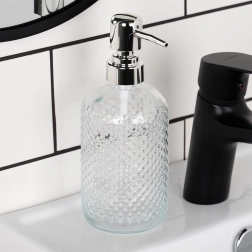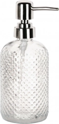 Ez a stílusos adagoló a áttetsző, minőségi üveget ötvözi a biztos fogást adó díszített textúrával és a tartós pumpával elegáns ezüst kivitelben. A 430 ml-es űrtartalomnak köszönhetően ideális mindennapi használatra a fürdőszobában és a konyhában, segít rendet és tisztaságot tartani.