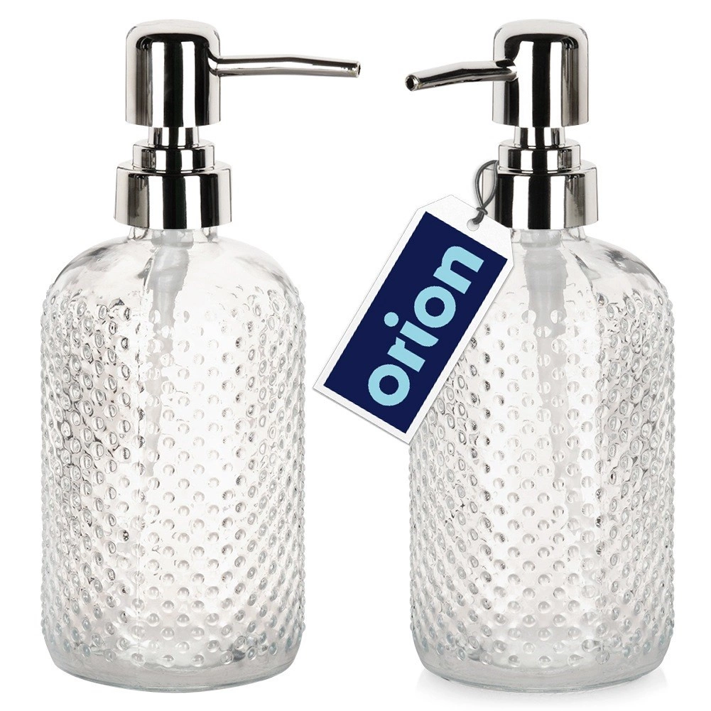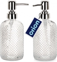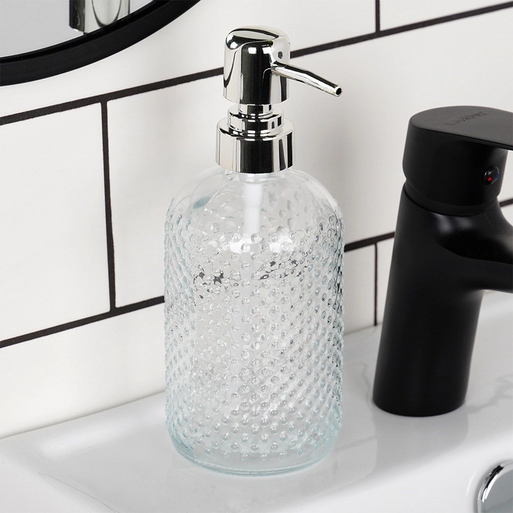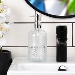 Elegáns, 430 ml űrtartalmú üveg szappanadagoló minőségi, átlátszó, díszített felületű üvegből, ezüst színű pumpával. Tökéletes a fürdőszobába és a konyhába, lehetővé teszi a kényelmes utántöltést, a szint ellenőrzését az átlátszó testnek köszönhetően, és modern dizájnt valamint praktikus, higiénikus adagolást kínál folyékony szappanhoz vagy mosogatószerhez.