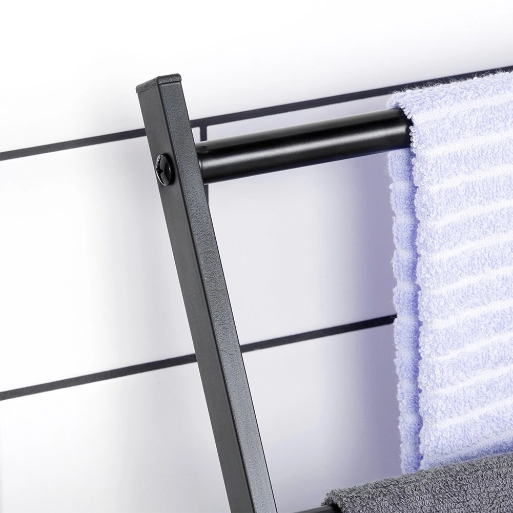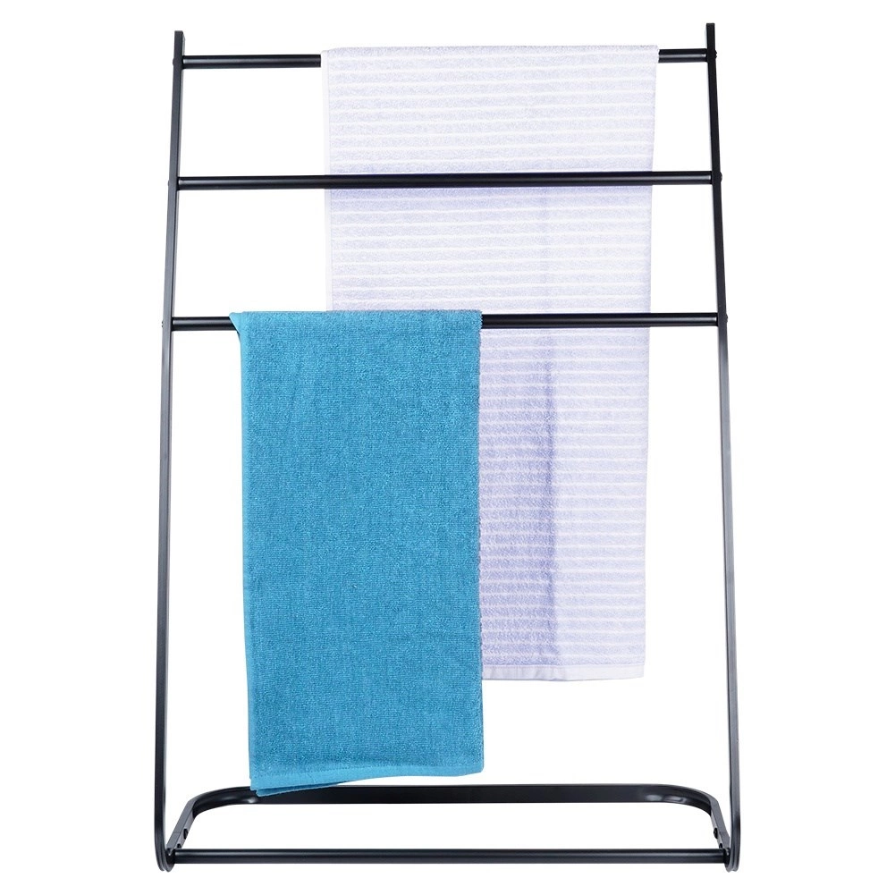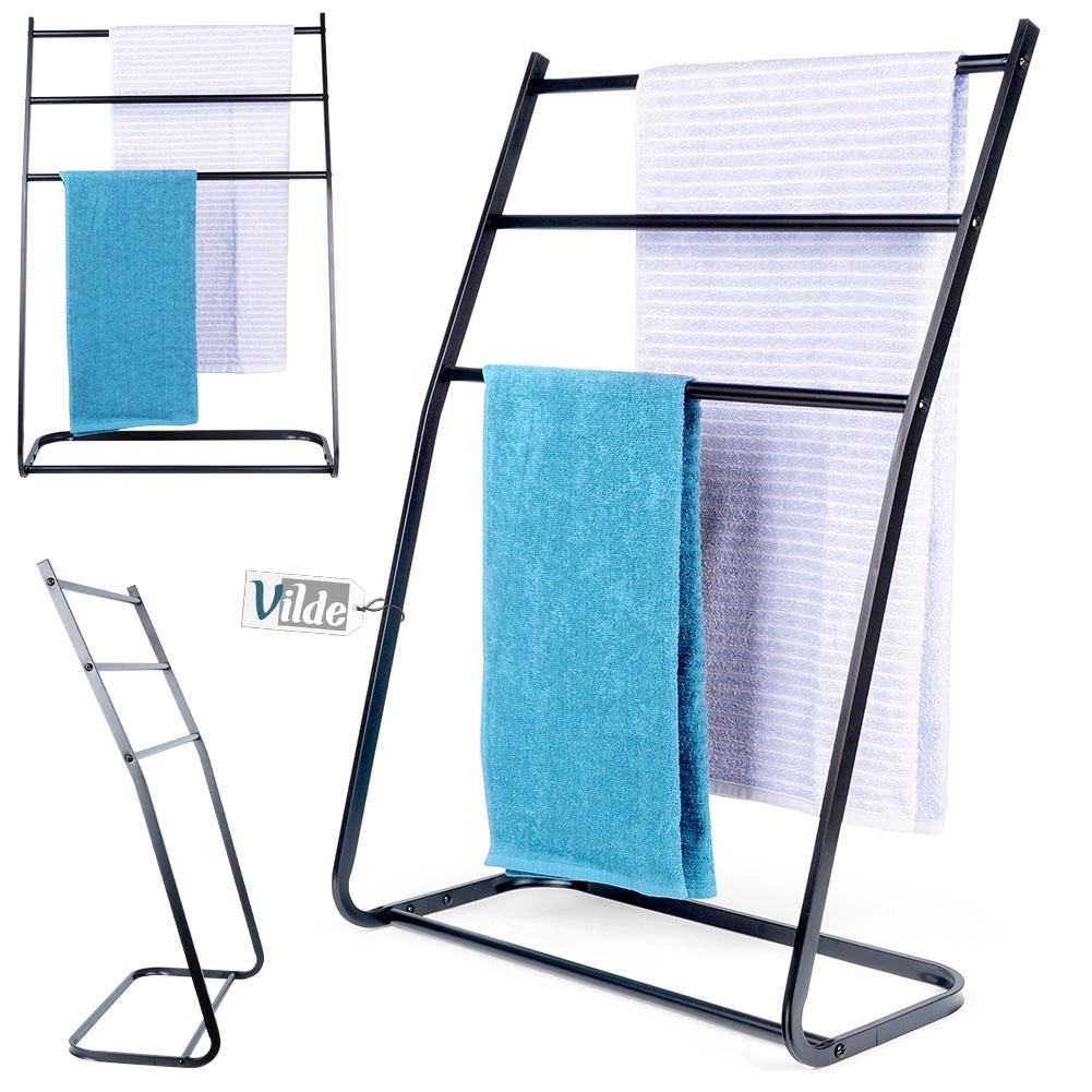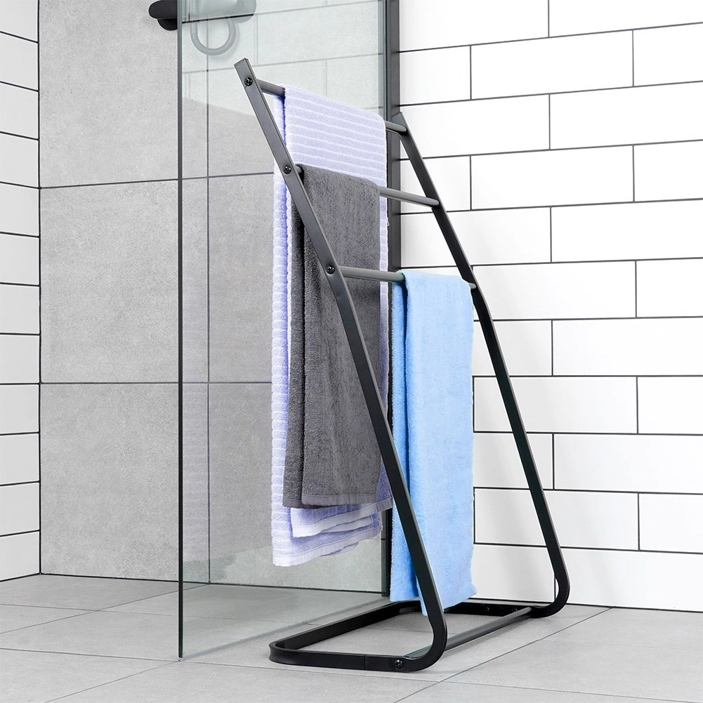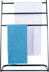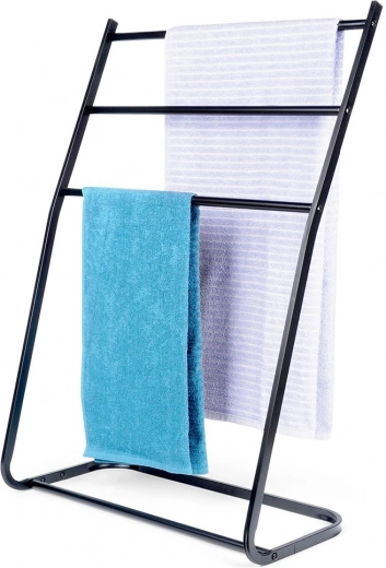 Szabadon álló fém törölköző- vagy ruhatartó, három erős rúddal különböző szinteken az optimális légáramlás és a gyorsabb száradás érdekében. A fekete, minimalista dizájn letisztult és időtálló, így remekül illik modern és klasszikus stílusú fürdőszobákba is.