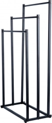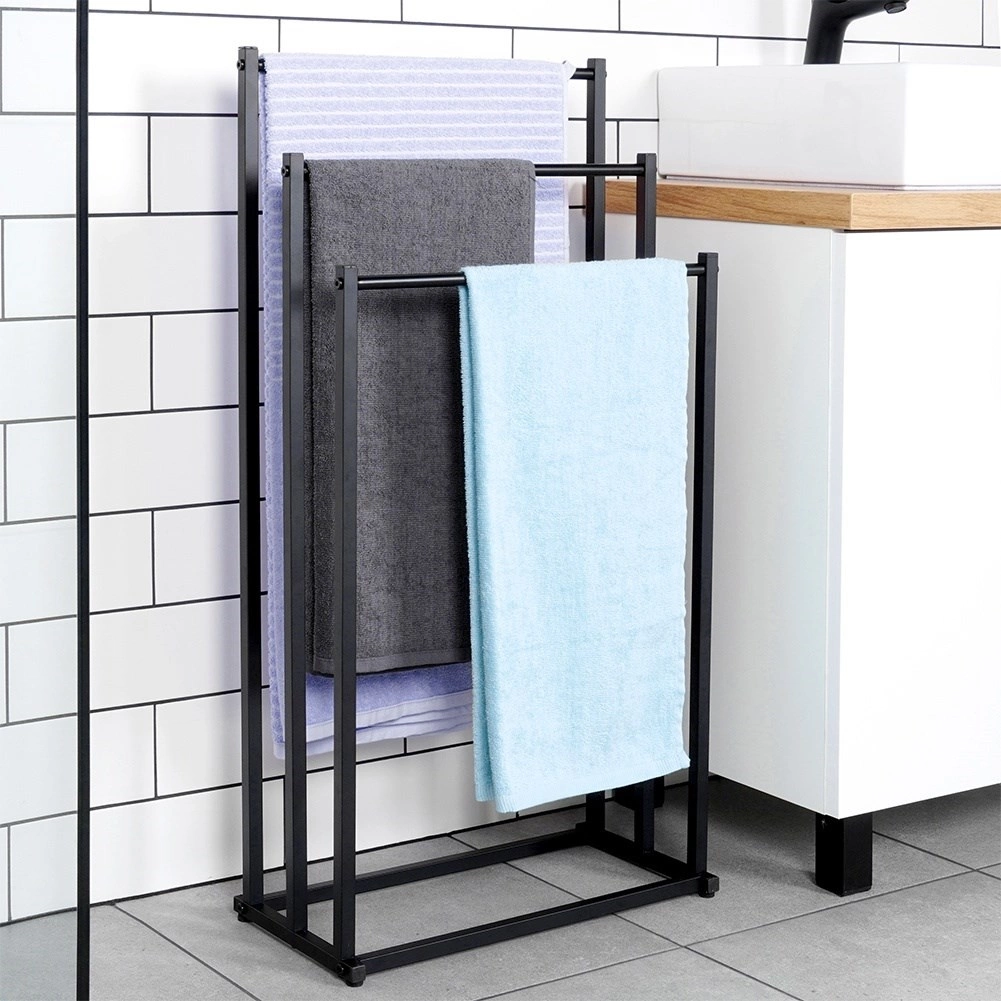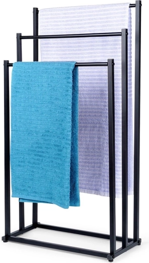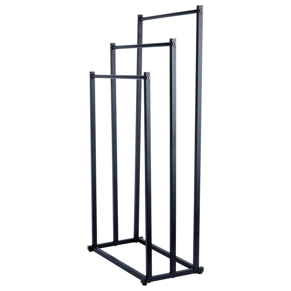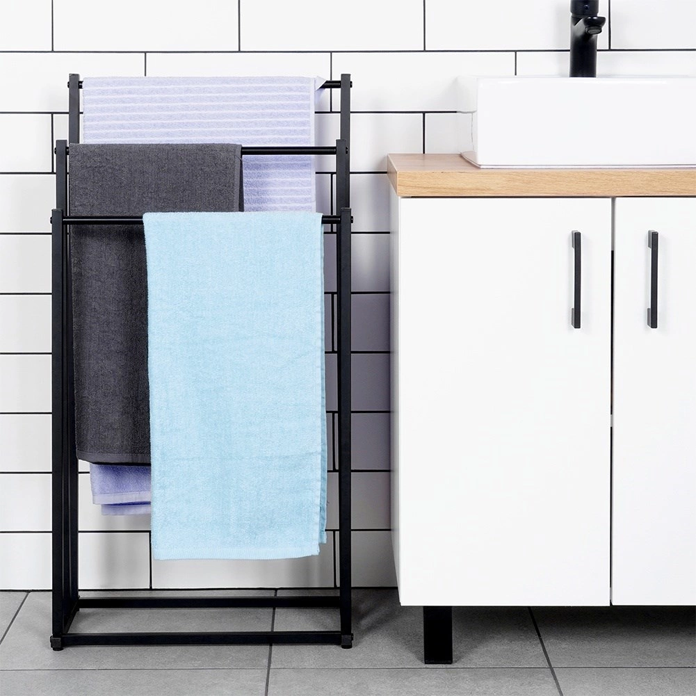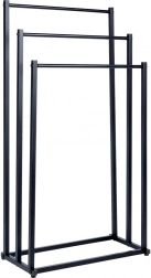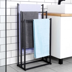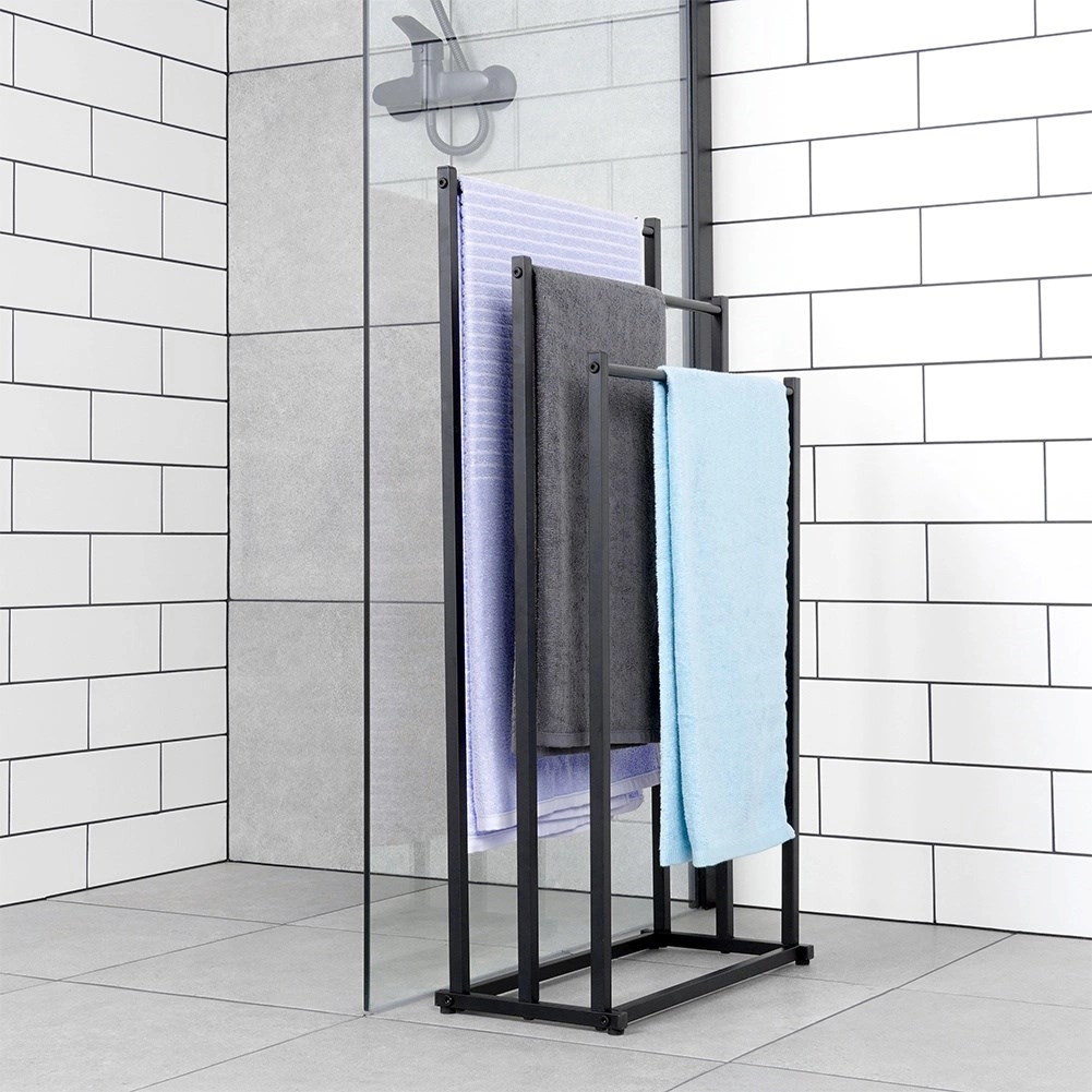Praktikus, szabadon álló törölköző- vagy ruhatartó három, lépcsőzetesen elrendezett rúddal az átlátható tárolásért és a jobb légáramlásért, így a textíliák gyorsabban száradnak. Minimalista, matt fekete megjelenése jól illik a modern enteriőrökhöz, és ipari karaktert ad a fürdőszobának.