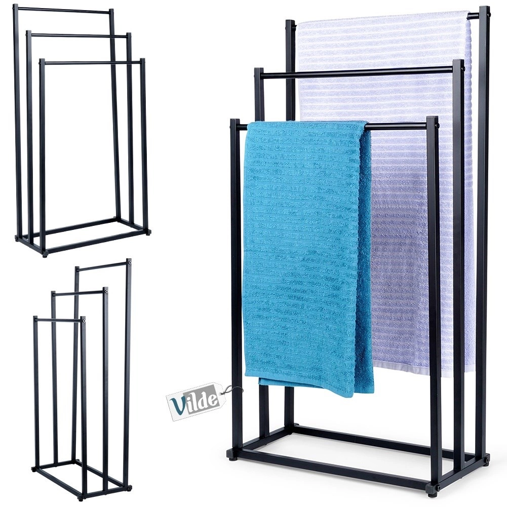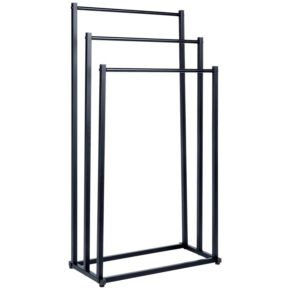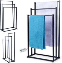 Elegáns, szabadon álló törölközőtartó három, lépcsőzetesen elhelyezett rúddal, amely gyors száradást, helytakarékos megoldást és stabil, porfestett fém szerkezetet kínál matt fekete színben. Ideális modern és klasszikus fürdőszobába egyaránt, könnyű összeszereléssel és stílusos loft dizájnnal.