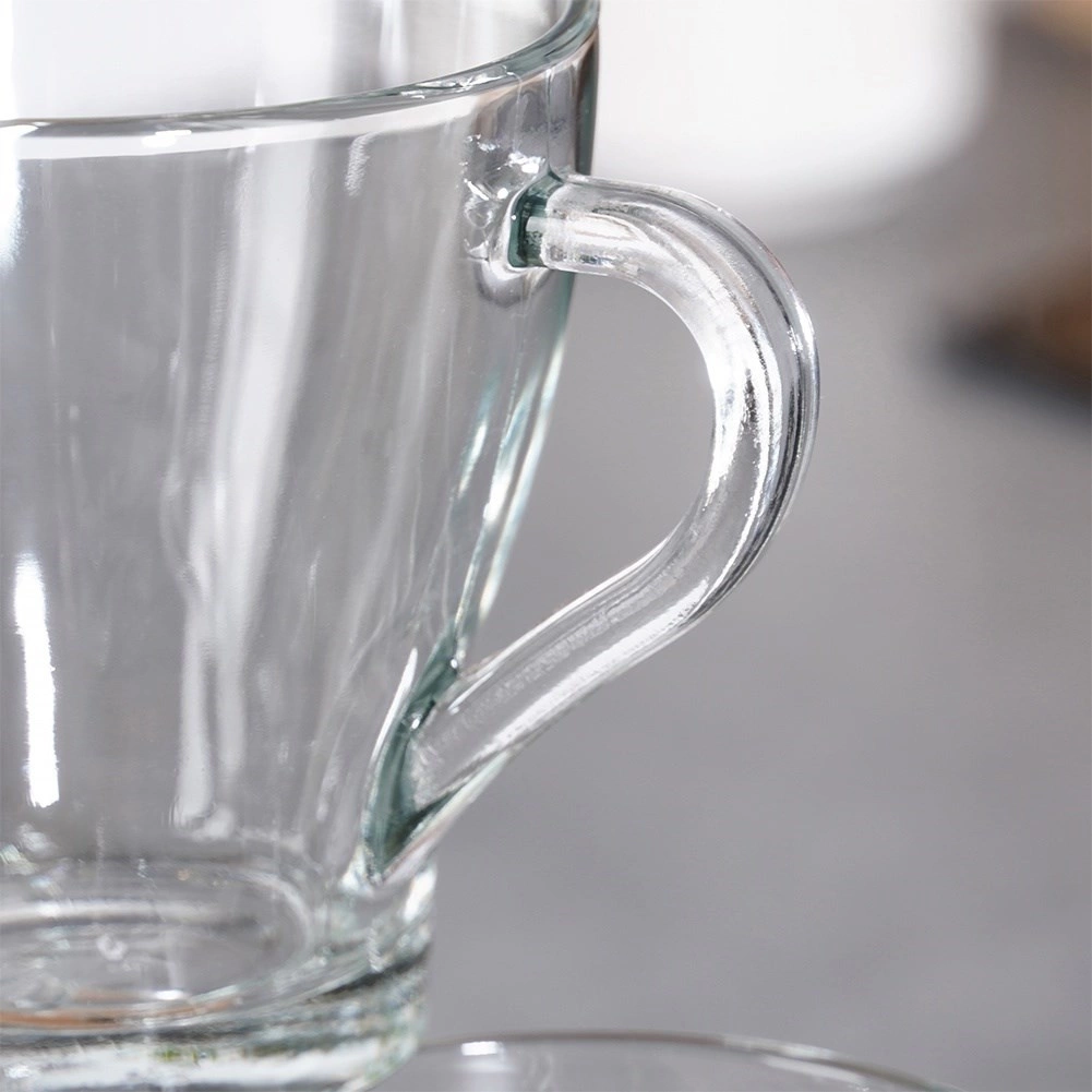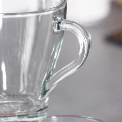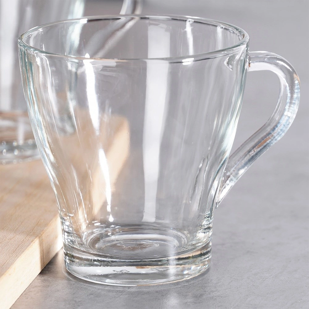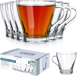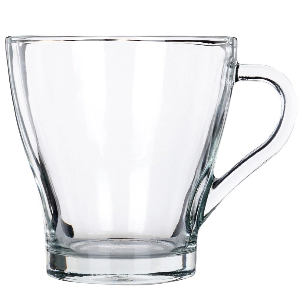 Elegáns, 6 darabos, 250 ml űrtartalmú, füles pohárkészlet mindennapi használatra és különleges alkalmakra. Magas minőségű, vastag üvegből készül, forró és hideg italokhoz egyaránt alkalmas, ergonomikus füllel a biztonságos fogásért. A poharak átlátszóak a látványos tálaláshoz, és könnyen tisztíthatók – mosogatógépben és mikrohullámú sütőben is használhatók.