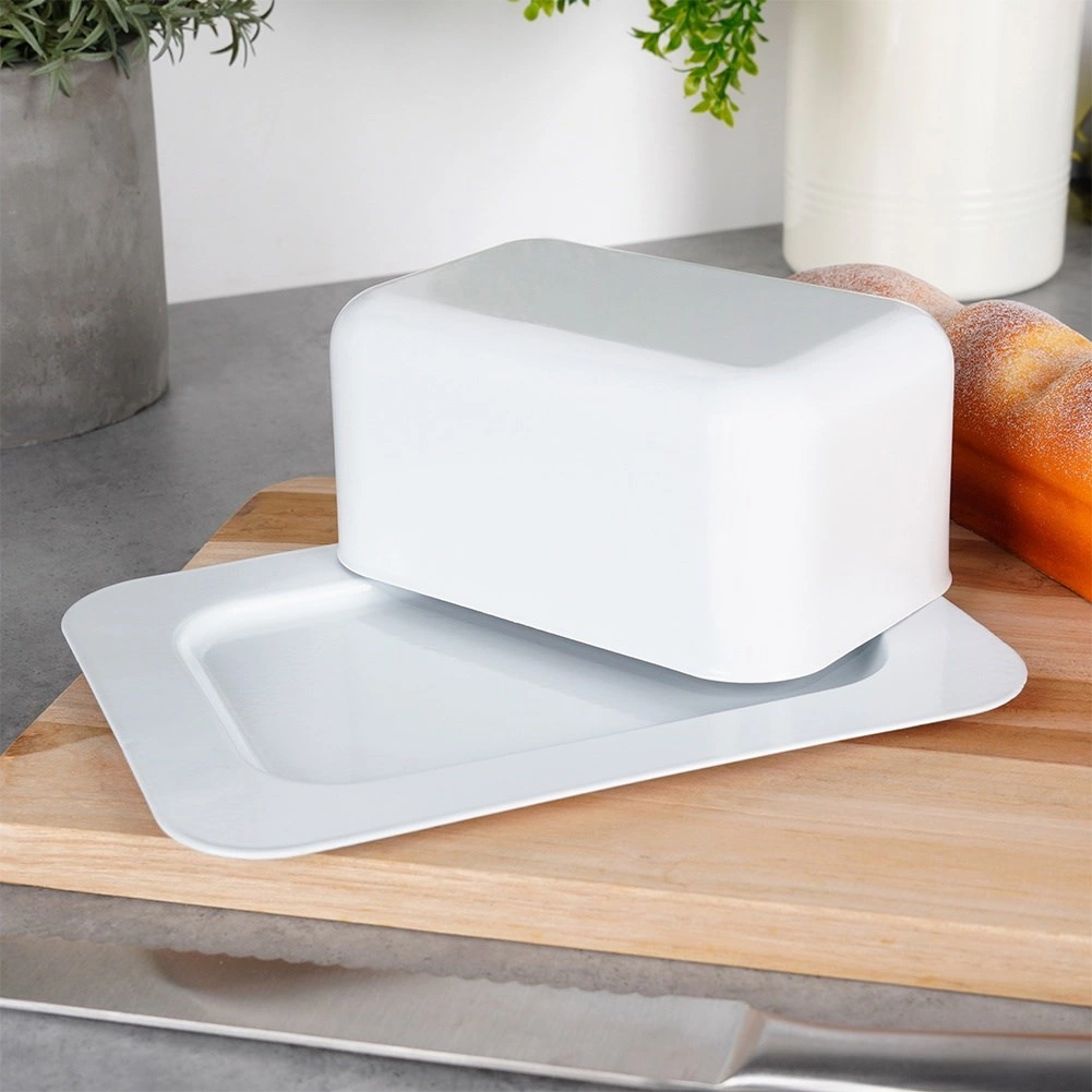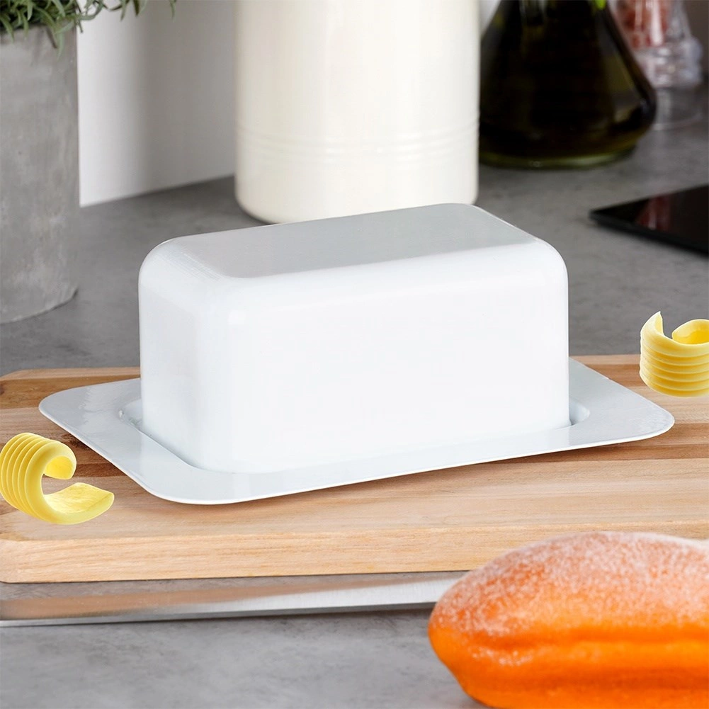 Stílusos acél vajtartó fehér színben, ideális a vaj tárolásához és tálalásához otthon és vendégfogadáskor egyaránt. A porszórt felület elegáns hatást kelt, és növeli a karcállóságot is.