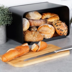A modern kenyértartó a matt fekete fémet és a természetes bambuszt ötvözi, hatékonyan korlátozza a levegő bejutását, így a pékáru tovább marad puha és ízletes. A masszív fémtest tartós, és megóvja a pékárut a mechanikai sérülésektől, míg a természetes fedél melegséget és eleganciát kölcsönöz a konyhának.