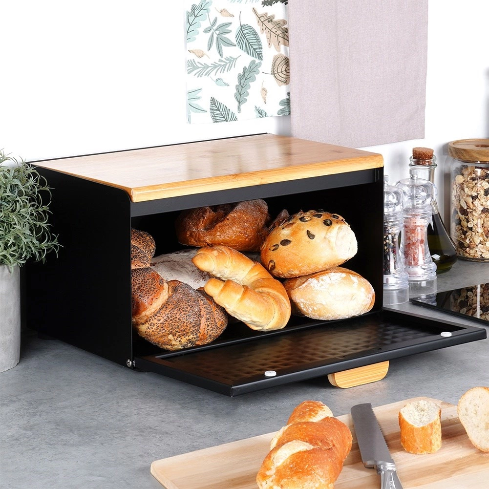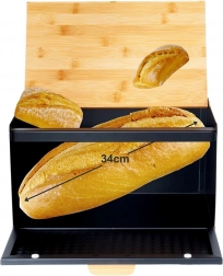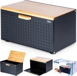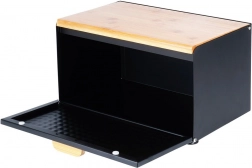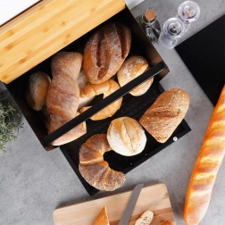 Dekoratív felületstruktúrája és a fekete–fa kombináció kiemeli az elegáns megjelenést. A felső lap vágódeszkaként is használható – így minden kéznél van. A kenyértartó elég tágas kenyérhez, zsemléhez, bagetthez és édessüteményekhez, a filc talpak pedig megakadályozzák a munkalap karcolódását.