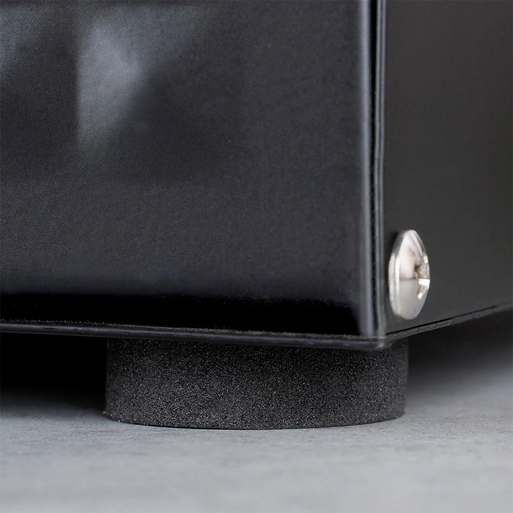 A fekete, porszórt fém texturált előlapjával és fa fogantyújával egyszerre tartós és elegáns. A csúszásgátló talpak védik a munkalapot.