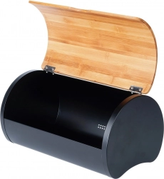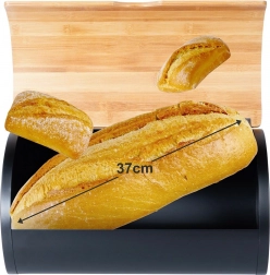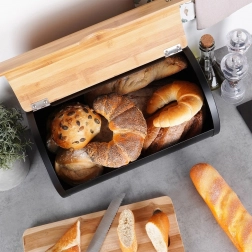 Elegáns, fekete acél kenyértartó természetes bambusz fedéllel, amely a pékárut tovább frissen tartja, védi a levegőtől és portól, és stílusosan kiegészít bármely konyhát. Masszív kialakítása tartósságot biztosít, tágas beltere különféle péksüteményeknek ad helyet, a praktikus fedél pedig gyors és kényelmes nyitást tesz lehetővé.