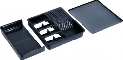 A rendező minőségi, masszív műanyagból készült elegáns fekete színben, könnyen tisztítható, és jól bírja a mindennapos használatot. Ideális választás modern konyhába, ahol fontos a rend, a gyors hozzáférés az eszközökhöz és az éles pengék biztonságos tárolása.