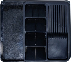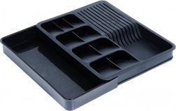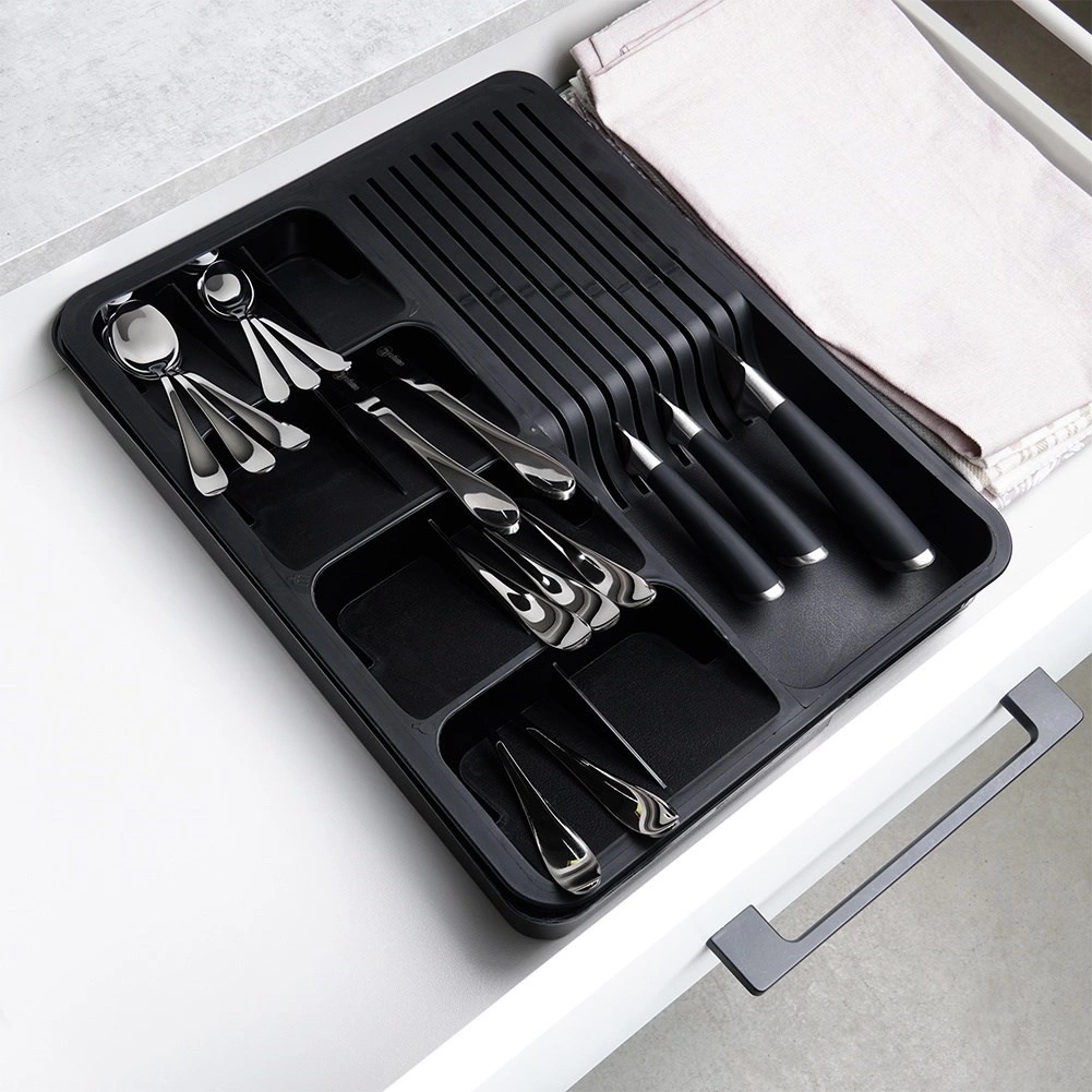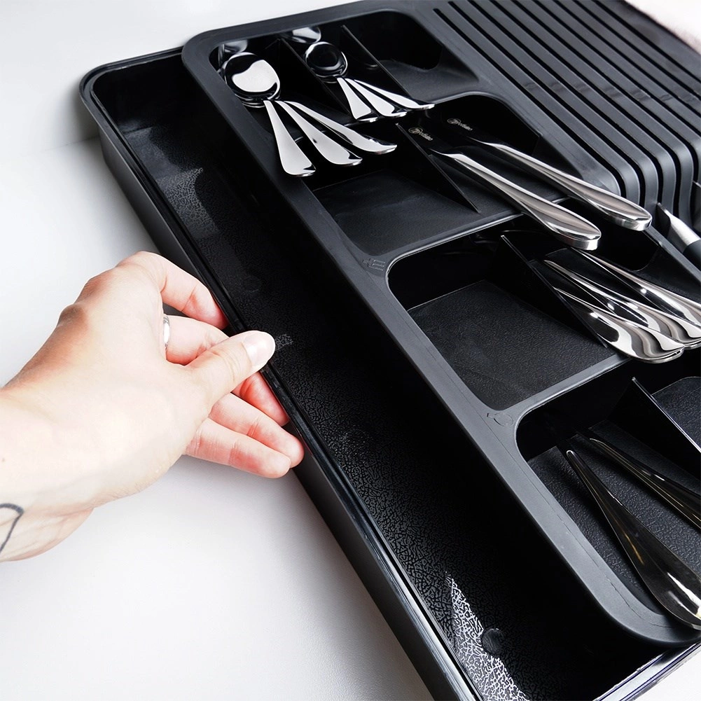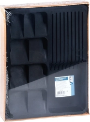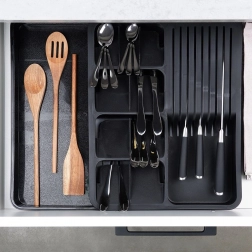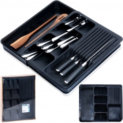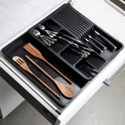 Praktikus fekete fiókbetét, amely egy helyen rendezi az evőeszközöket, konyhai eszközöket és késeket. Átlátható rekeszeket és egy speciális, akár 9 kés számára kialakított részt kínál. Az alapméret 40 × 31 × 5 cm, amely a bővíthető elemnek köszönhetően egészen 45,5 cm-ig növelhető a nagyobb tárolóhelyért. Tartós műanyagból készült, könnyen tisztítható, és rendet tart bármelyik konyhában.