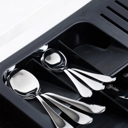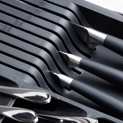 Tartsd a fiókokat tökéletesen átláthatóan. A bővíthető fiókbetét okos rekeszelrendezést kínál a kanalak, villák, kések és konyhai eszközök számára, valamint egy dedikált blokkot akár kilenc kés biztonságos tárolásához. A bővíthető elemnek köszönhetően könnyedén a fiókhoz igazíthatod a tárolóhely szélességét, és kihasználhatsz minden centimétert.