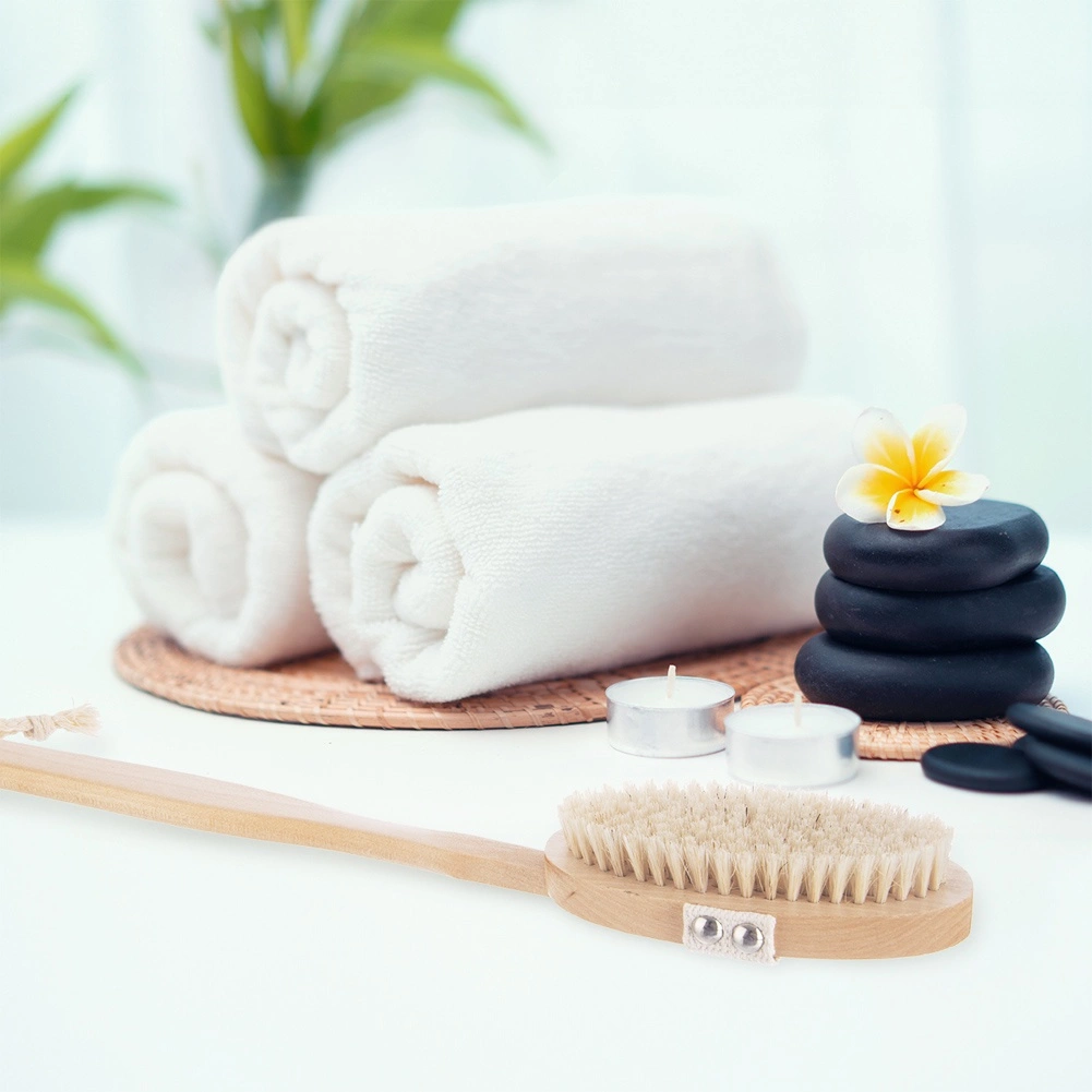 Adjon bőrének mindennapi spa-élményt. A 42 cm hosszú, 12,5 × 7 cm fejű 2 az 1-ben fa masszázskefe ideális a hát eléréséhez és a teljes test ápolásához. Használható szárazon az intenzív radírozáshoz és a bőr feszesítéséhez, illetve nedvesen zuhanyzás vagy fürdés közben.