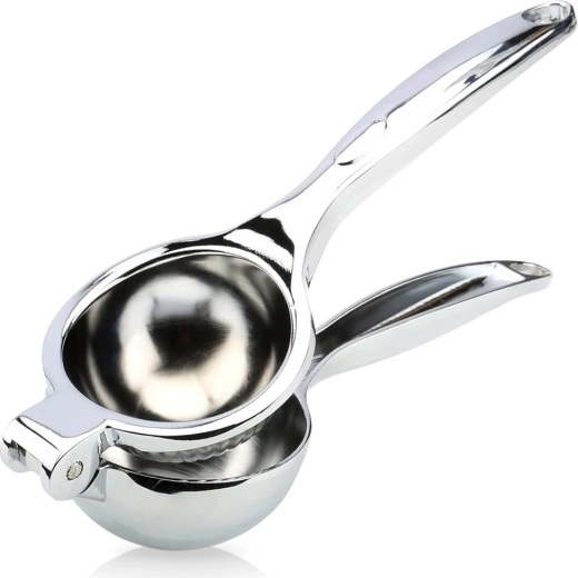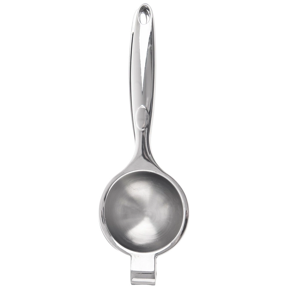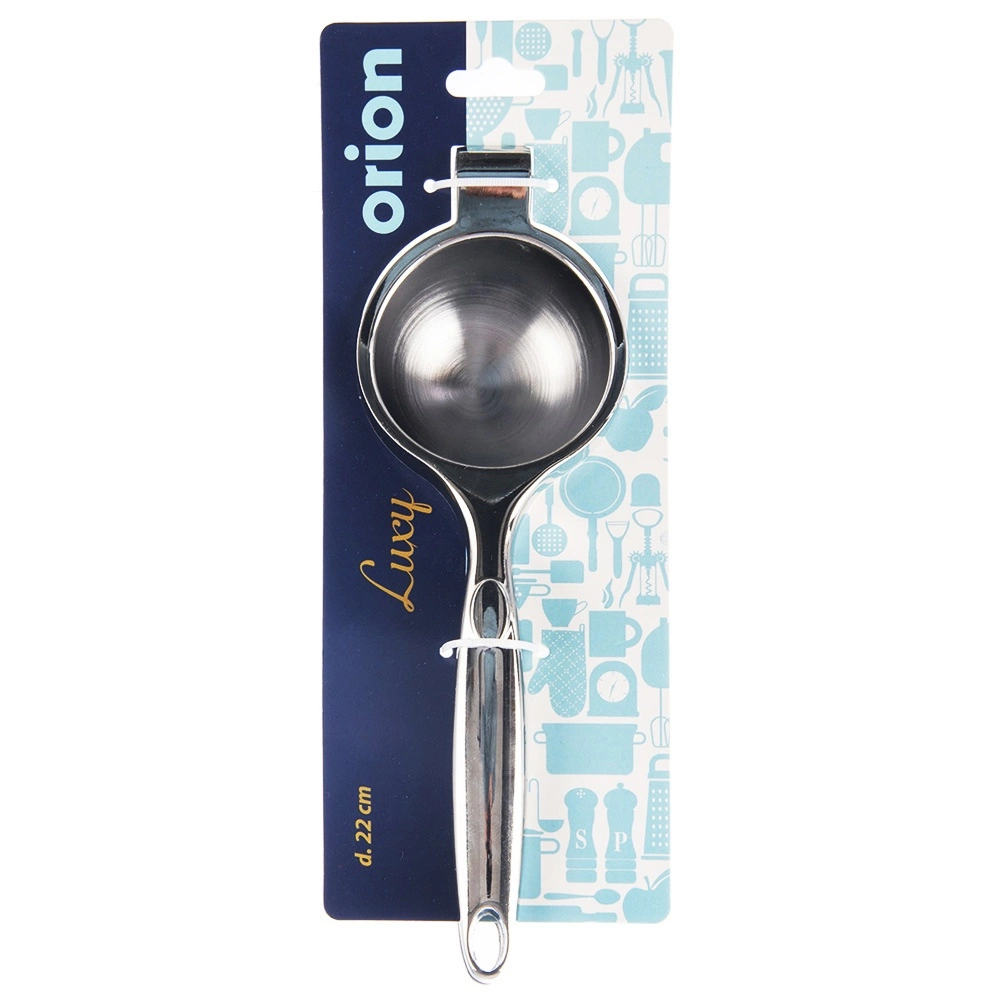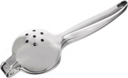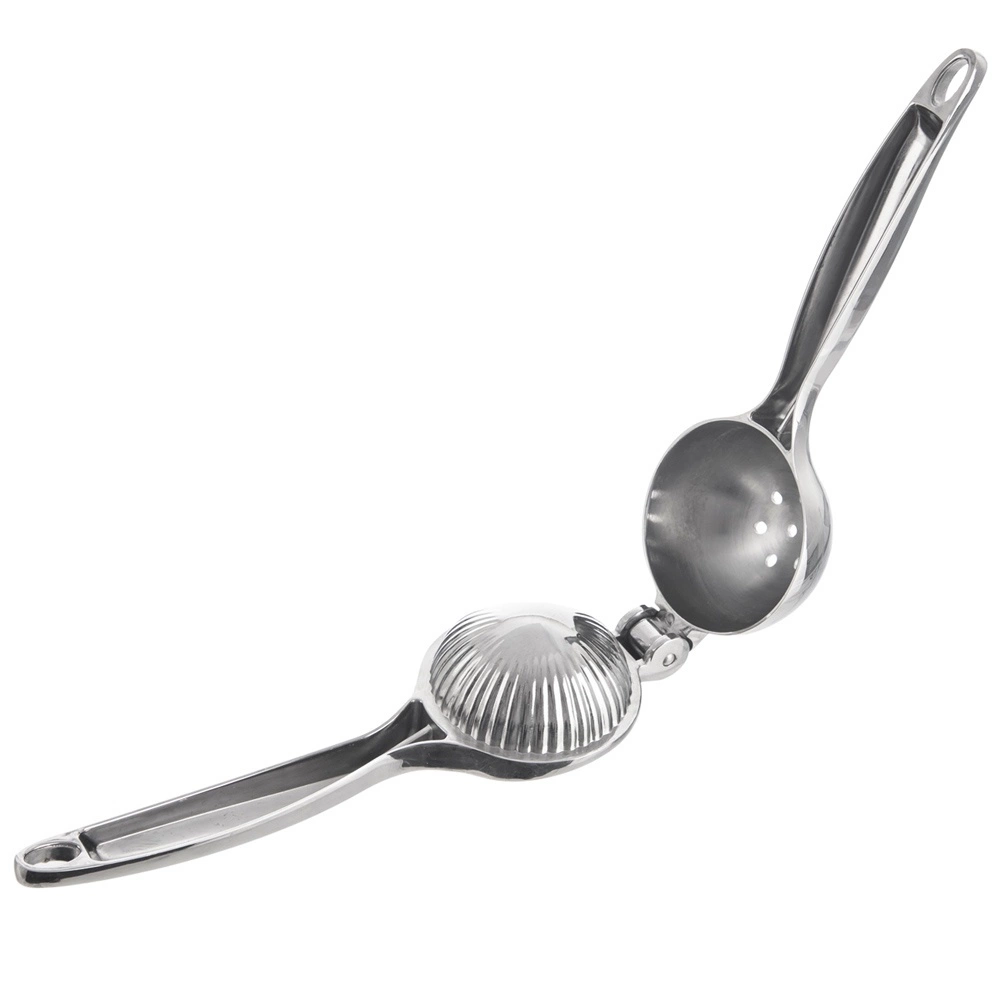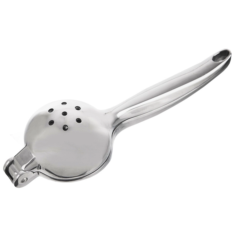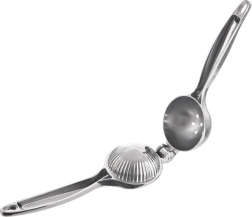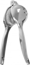 Praktikus kézi citrusprés tartós fémből, 22 × 7 cm méretben a gyors és kényelmes facsarásért. Az ergonomikus fogantyúknak és a perforált tálkának köszönhetően maximális mennyiségű levet nyerhet ki magok és rostok nélkül. A teljesen fém, fényes rozsdamentes kivitel strapabíró, higiénikus és könnyen tisztítható – mosogatógépben is mosható.