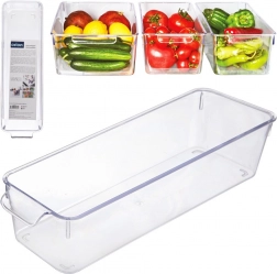 Praktikus, átlátszó hűtőszervező 32,5 × 10 × 7,5 cm méretben, amely segít rendet tartani és a helyet maximálisan kihasználni. Beépített fogantyújának köszönhetően könnyen kihúzható, tartós műanyagból készült, és élelmiszerbiztonságos. Ideális áttekinthető tároláshoz gyümölcsöknek, zöldségeknek, tasakoknak és kisebb csomagoknak.