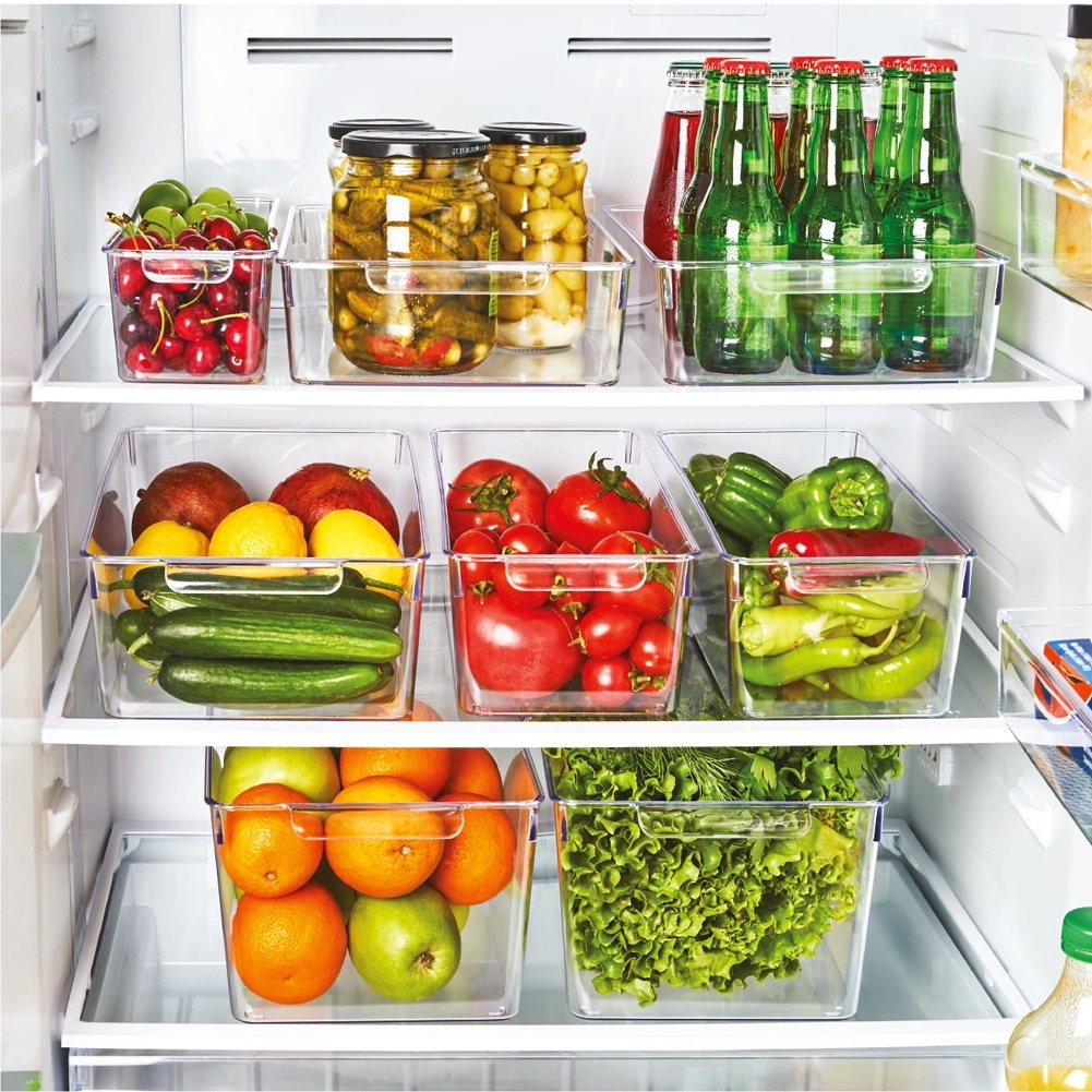 Ez a praktikus konyhai szervező minőségi, átlátszó műanyagból készült, és megkönnyíti az élelmiszerek válogatását és tárolását a hűtőben és a kamrában is. A transzparens kivitel azonnali rálátást biztosít a tartalomra, az integrált oldalsó fogantyú pedig könnyű kihúzást és hordozást tesz lehetővé. Nincs fedele, így villámgyors a hozzáférés az élelmiszerekhez.