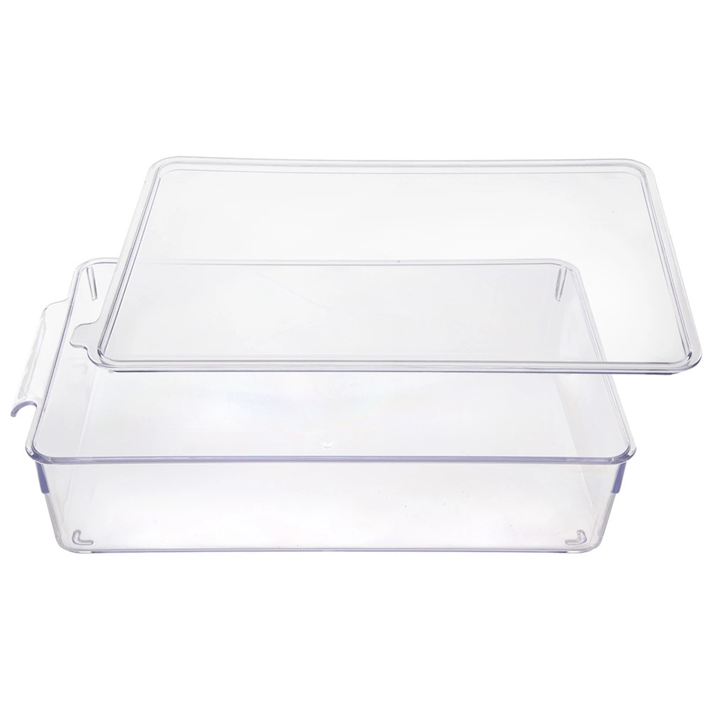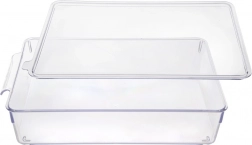 Tartson rendet a hűtőben ezzel a praktikus, fedeles szervezővel. Az átlátszó műanyag gyors tájékozódást tesz lehetővé a tartalomról, a levehető fedél segít tovább frissen tartani az élelmiszereket, és egyben lehetővé teszi a biztonságos egymásra helyezést. Az integrált oldalsó fogantyú kényelmes kihúzást biztosít polcról vagy fiókból.