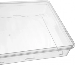 Az alacsony, egymásra rakható forma helyet spórol, és rendezetten tartja a hűtőt. Ideális szeletelt élelmiszerekhez.