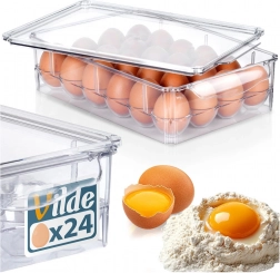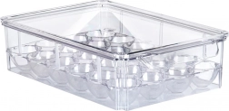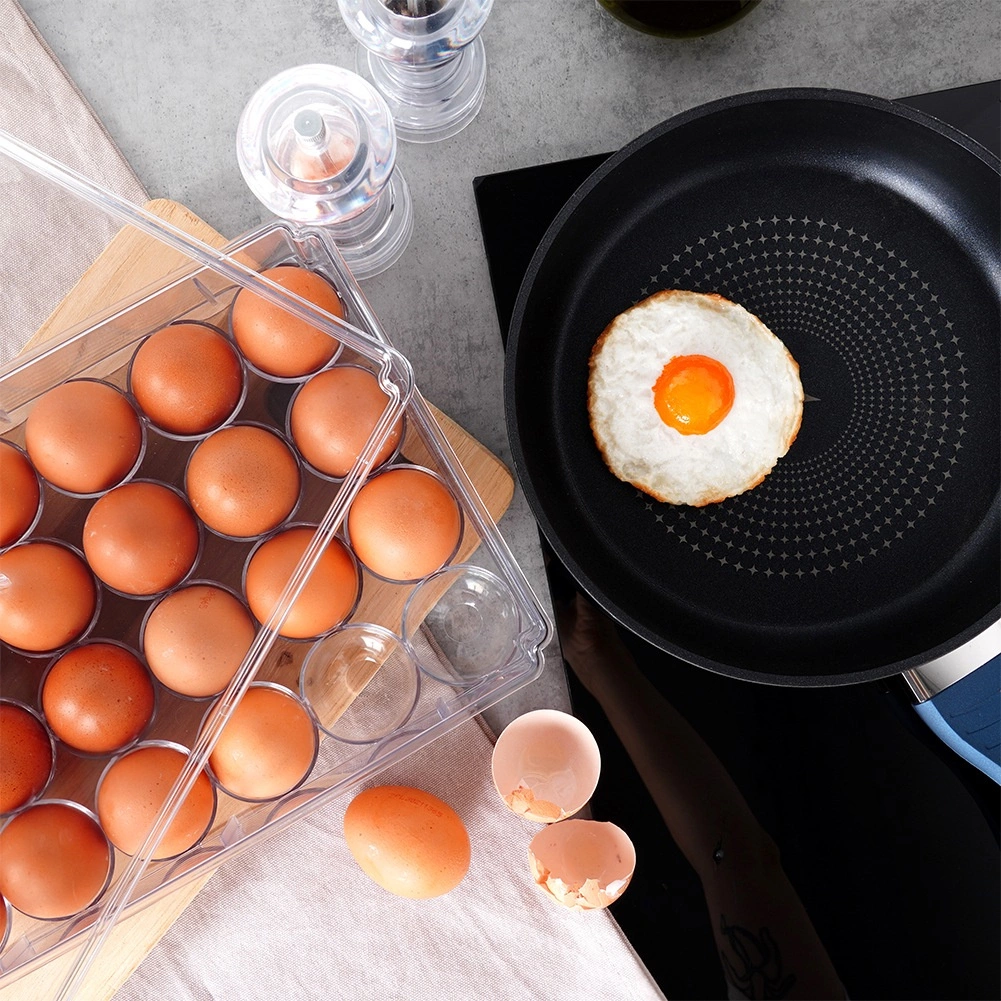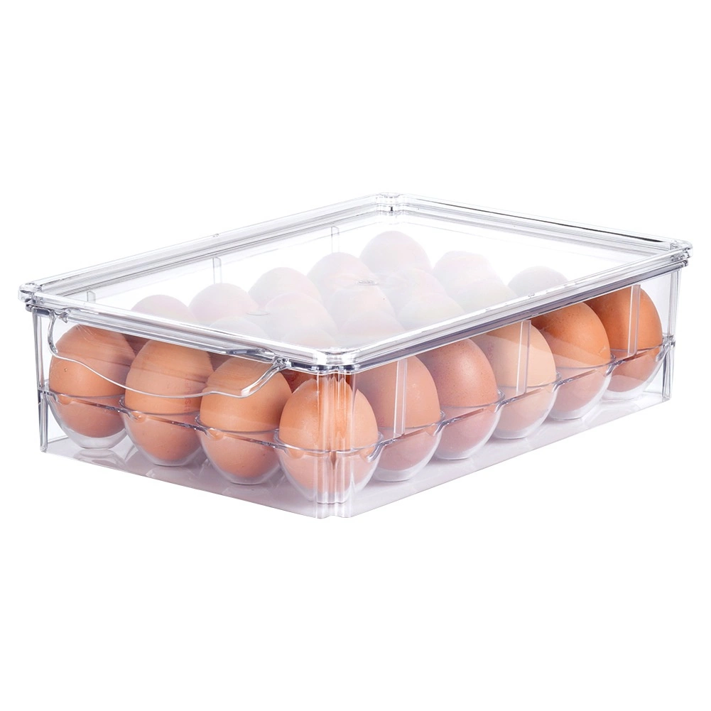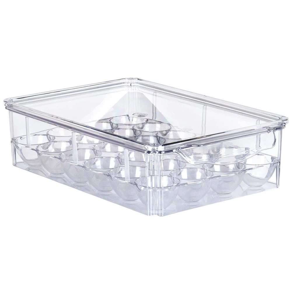 Tarts rendet a hűtőben ezzel a tágas tojásrendszerezővel, amely akár 24 darabot is befogad. A tartós és teljesen átlátszó kialakítás azonnali vizuális készletellenőrzést biztosít, míg a formázott fészkek biztonságosan rögzítik minden egyes tojást. A praktikus fedél megóv az idegen szagoktól és a nedvességtől, és lehetővé teszi több doboz kényelmes stócolását.