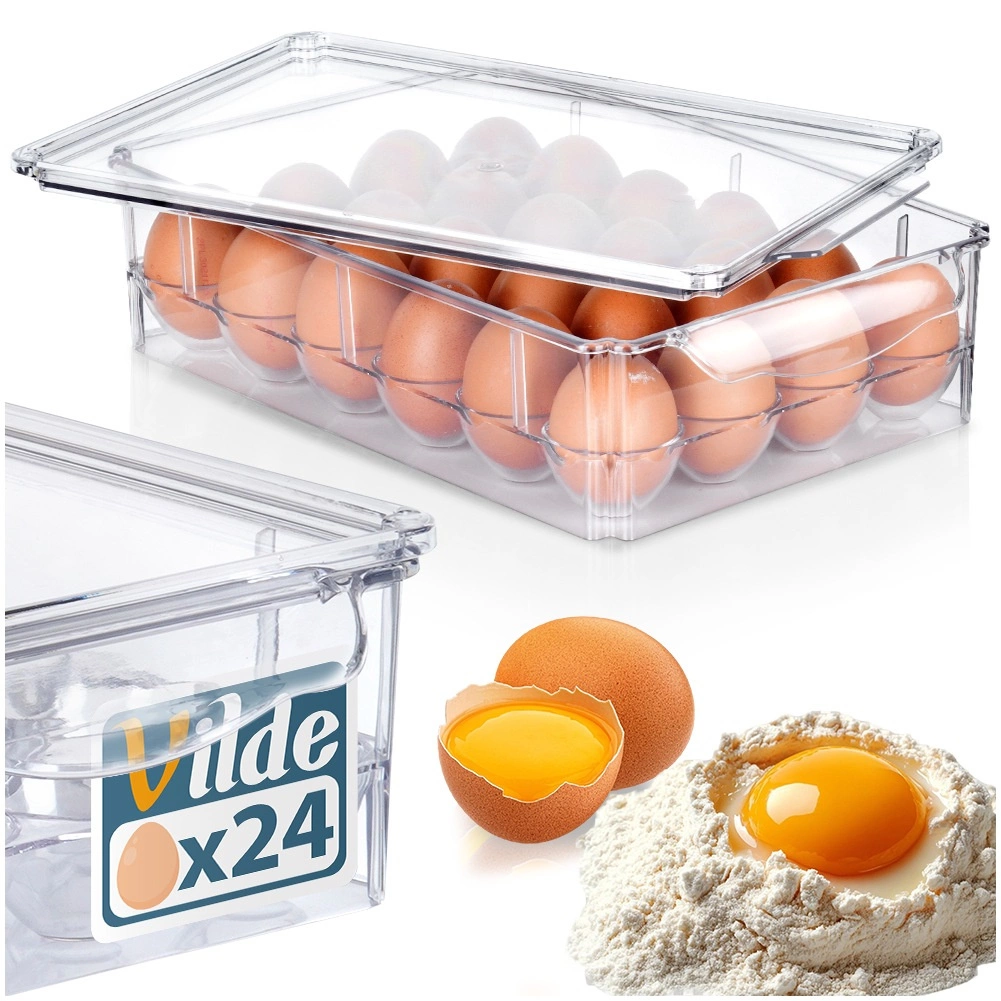 Praktikus tojásdoboz fedéllel, akár 24 tojás számára, amely áttekinthetően és biztonságosan tartja az élelmiszereket a hűtőben. A áttetsző kialakításnak köszönhetően mindig látod a készletet, a formázott rekeszek megakadályozzák a mozgást és a sérülést, a stócolható design pedig helyet takarít meg. A könnyű tisztítás gondtalan karbantartást biztosít.