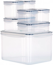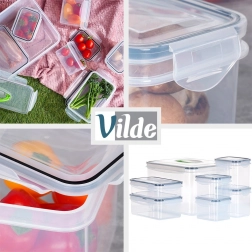 Ez a sokoldalú készlet öt méretet tartalmaz alapanyagok, ételek és uzsonnák tárolásához. Az átlátszó kivitel lehetővé teszi a gyors tartalomellenőrzést nyitás nélkül, a négy oldalsó klipsz és a szilikon tömítés pedig megbízható zárást biztosít tárolás és szállítás közben.