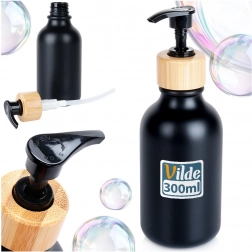 Elegáns adagoló folyékony szappanhoz vagy mosogatószerhez, 300 ml űrtartalommal, matt fekete kivitelben bambusz akcentussal. Kínál modern dizájnt, tartós és könnyű kialakítást, kényelmes utántöltést és zárható pumpát a biztonságos szállításhoz. Remekül illik a fürdőszobába és a konyhába, és segít megőrizni a rendet és a stílust.