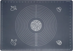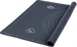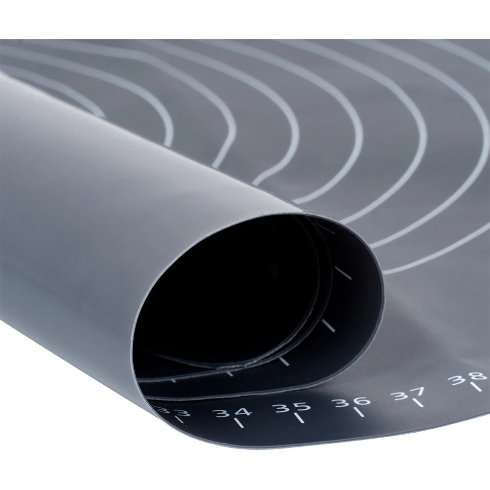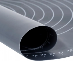 Praktikus, 64 × 45 cm-es szilikon nyújtólap, amely egyben munkalap és sütőlap. Tapadásmentes felületet, csúszásgátló rögzítést az asztalhoz és pontos mérőjelöléseket kínál centiméterben és koncentrikus körökkel a pizza, piték és kekszek könnyű formázásához. -40 °C-tól +260 °C-ig hőálló, alkalmas sütőbe, mikrohullámú sütőbe, fagyasztóba és mosogatógépbe, könnyen tisztítható, és helytakarékosság céljából feltekerhető.