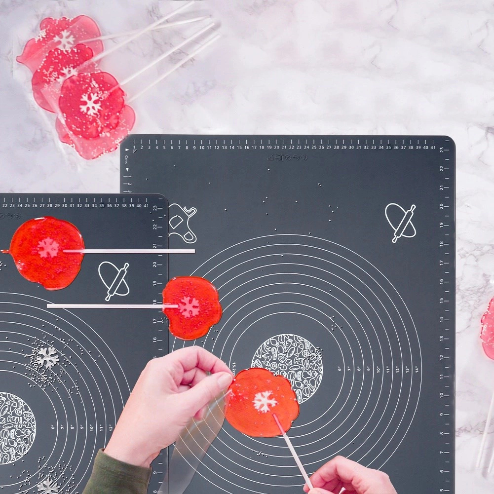 Nyomtatott vonalzók és koncentrikus körök centiméterben, amelyek megkönnyítik a tészta kívánt méretre nyújtását – ideális pizzához, pitékhez és tarte-okhoz.