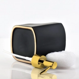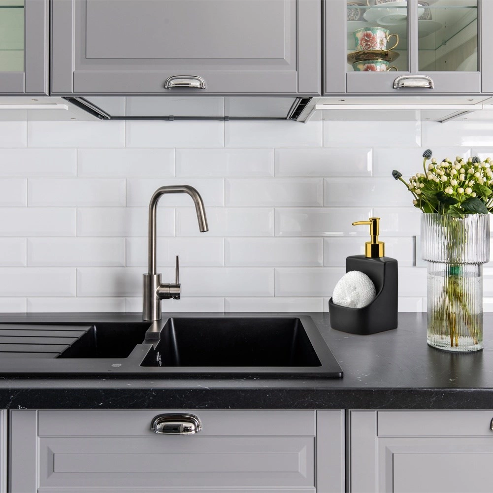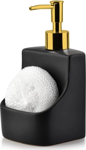 A praktikus mosogatószer-adagoló egyesíti a diszpenzert és a szivacsszervezőt egyben. Az integrált zsebnek köszönhetően a tisztítószerek mindig kéznél vannak, a munkafelület pedig tiszta és rendezett marad. A matt fekete kerámia a kontrasztos arany pumpával remekül illik modern, klasszikus és indusztriális konyhákba is.