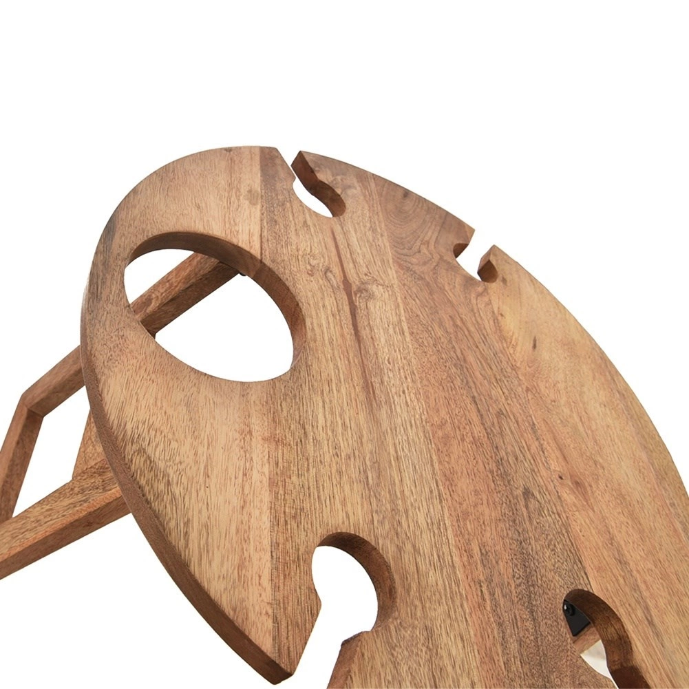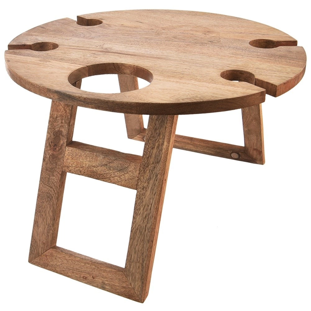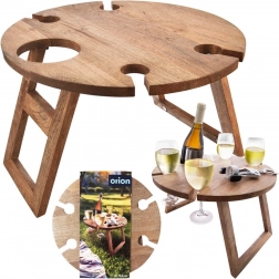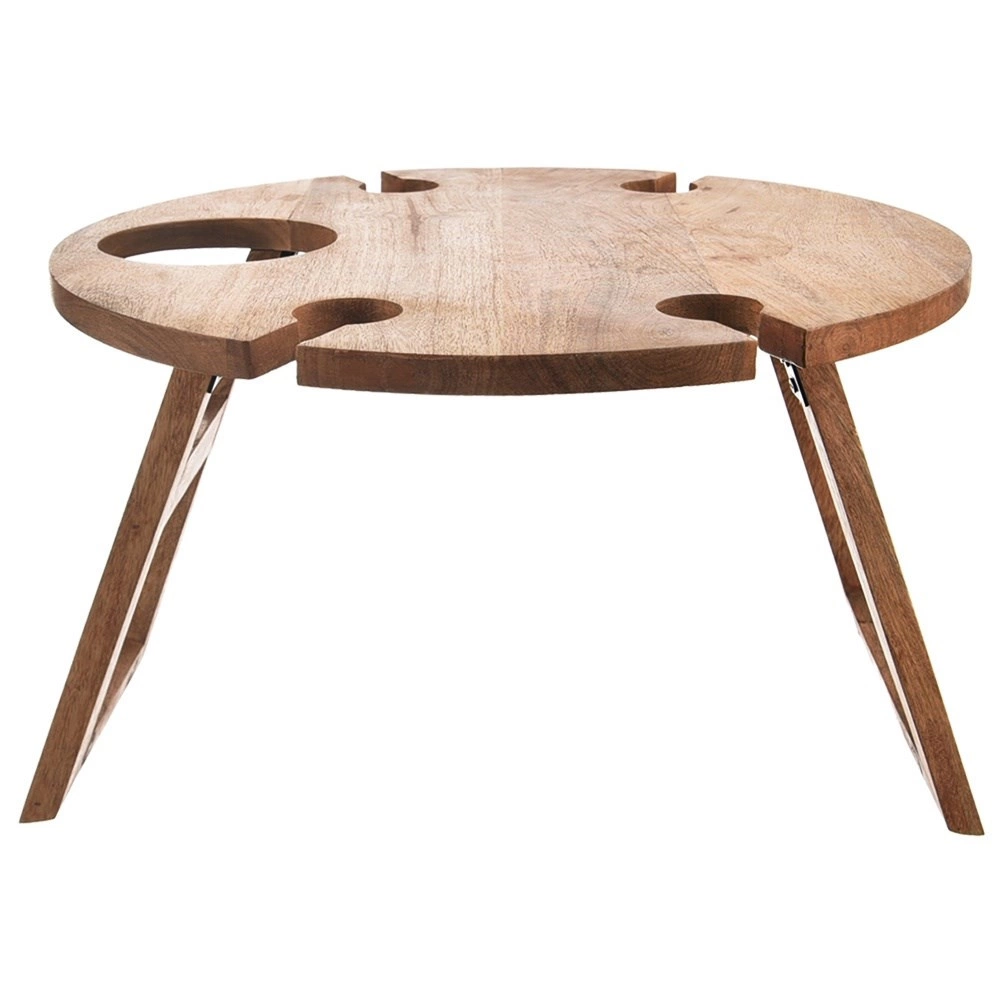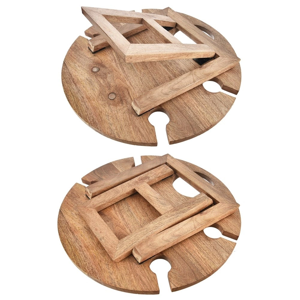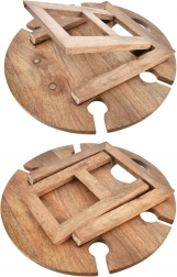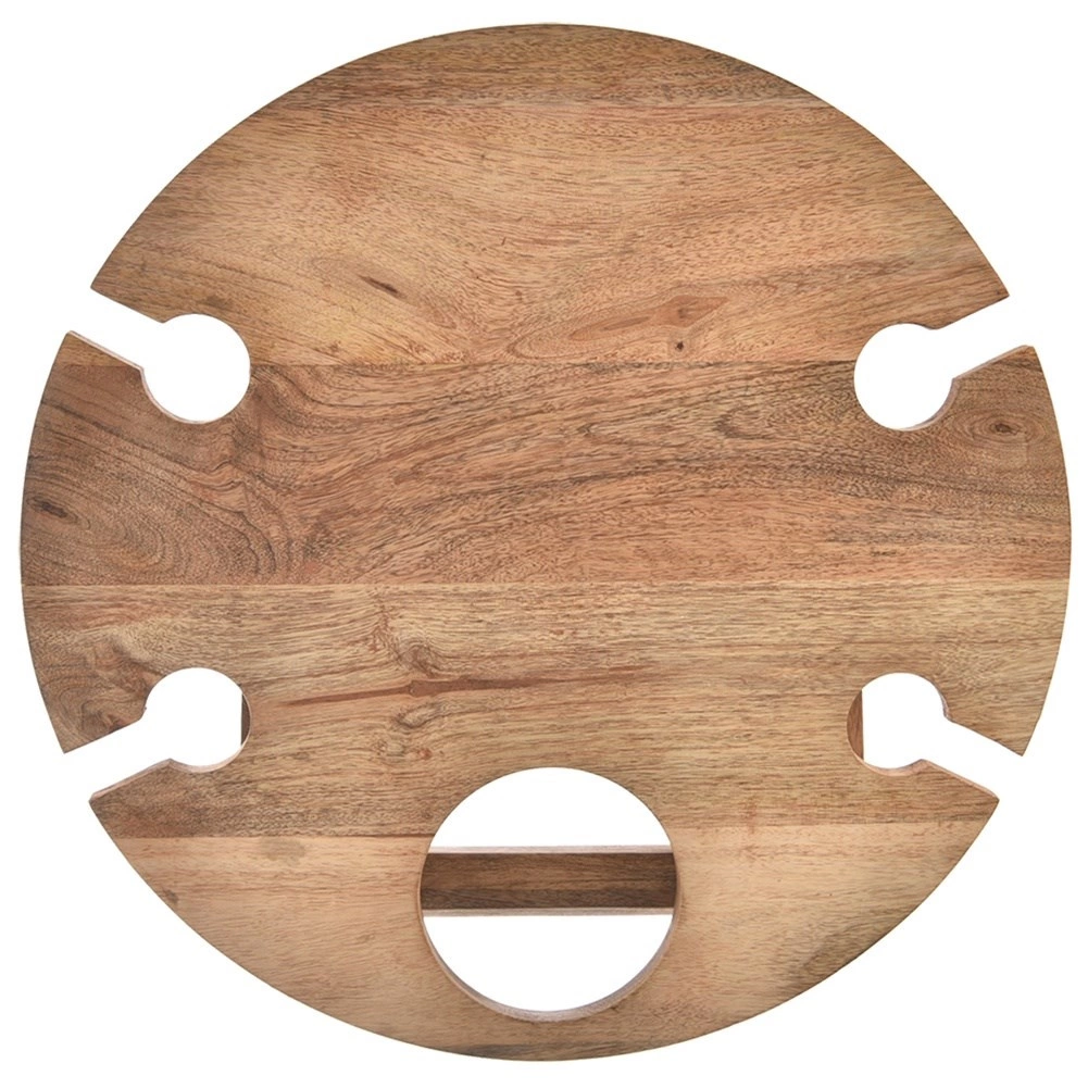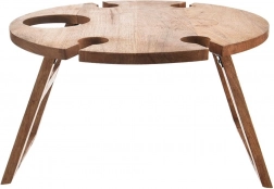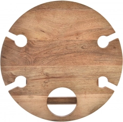 Ez a praktikus, alacsony asztal kényelmes étkezéshez készült a természetben és otthon is. A pontos kivágásokkal ellátott lap stabilan tartja a palackot és 4 poharat, így az italok kevésbé egyenletes felületen is biztonságban maradnak. A természetes mangófa különleges erezetet és kiváló nedvességállóságot kínál.