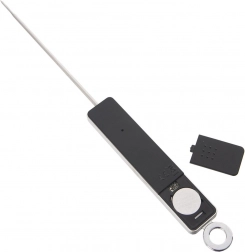 A tartós kialakítás rozsdamentes acélt és masszív műanyag házat kombinál fekete színben. A praktikus szondavédő sapka megkönnyíti a biztonságos tárolást és a szállítást, az akasztófül pedig felakasztást tesz lehetővé a konyhában. Tápellátás: 1× CR2032 elem (nem tartozék).