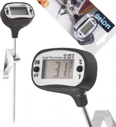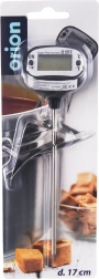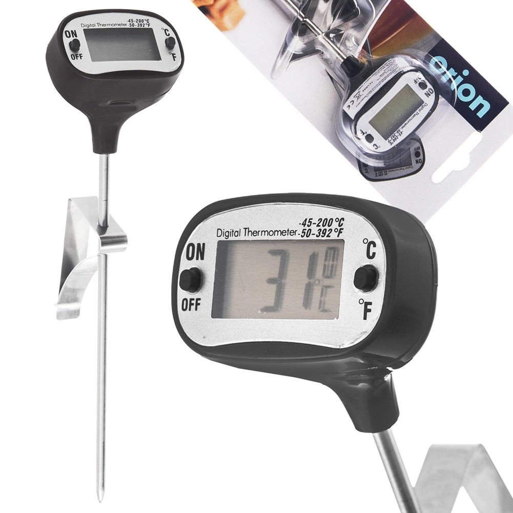 Az ORION digitális beszúró hőmérő megbízható segítőtárs minden konyhában. A rozsdamentes szondának köszönhetően pontosan méri a hús, levesek, tej vagy szirupok belső hőmérsékletét. A fényes LCD kijelző és az ON/OFF, valamint °C/°F gombok kényelmes kezelést biztosítanak, míg a fém klipsz stabilan a fazék peremén tartja a szondát.
