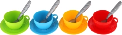 - Teáskanna, 4 csésze, 4 csészealj, 4 kanál (színes összeállítás)