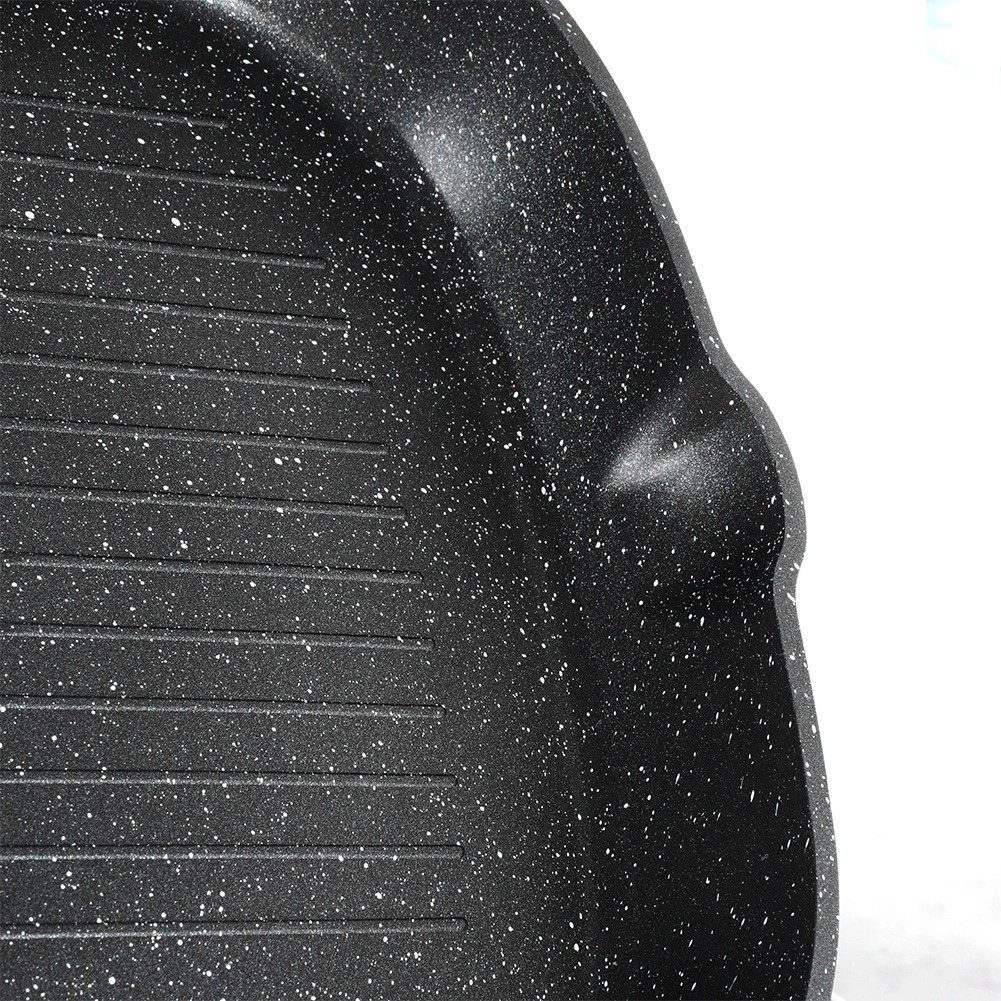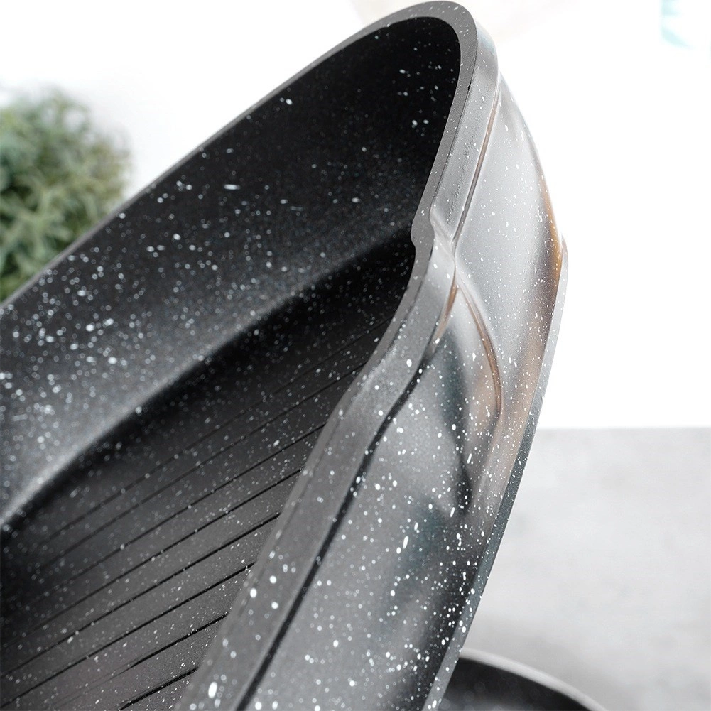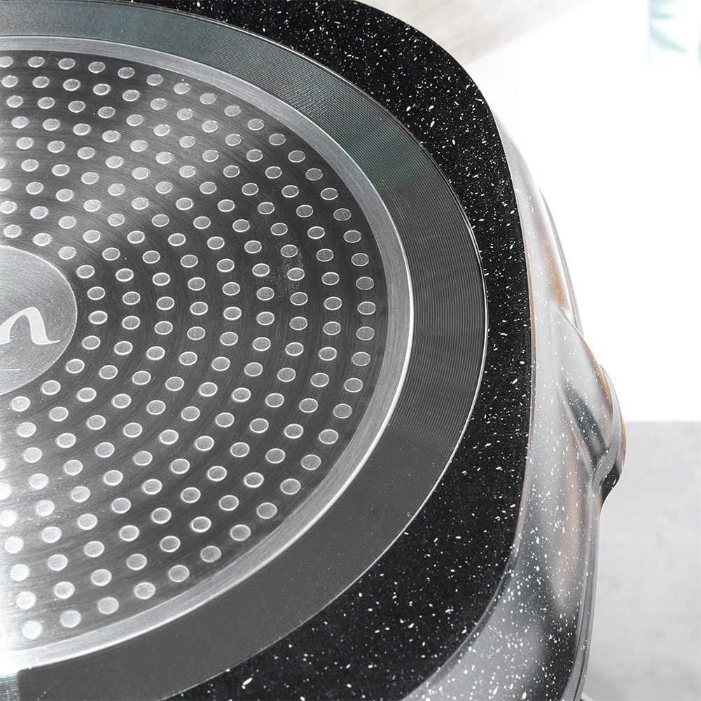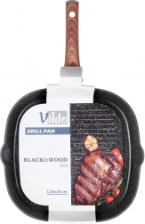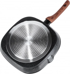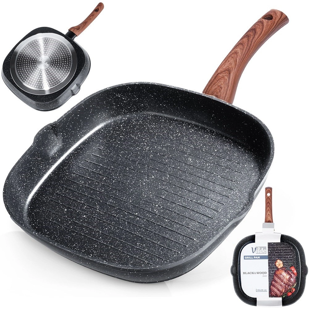 Stílusos grillserpenyő fekete kőhatás és fa kombinációjával, amely modern hangulatot kölcsönöz a konyhának, és lehetővé teszi az egészséges főzést minimális zsiradékkal. A magasabb bordázat elvezeti a felesleges zsírt, intenzív sear csíkokat és szaftos eredményt ad húsoknál, zöldségeknél és burgereknél.